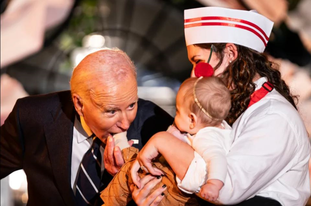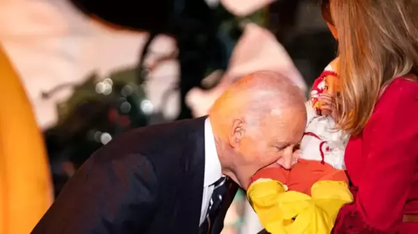 Çocuklarla vakit geçirmekten keyif alan Biden, etkinlik sırasında hindi kostümü giyen bir bebeğin bacağını, dondurma külahı kostümlü bir çocuğun ayağını ve mavi elbiseli başka bir bebeği şaka yollu ısırır gibi davrandı.