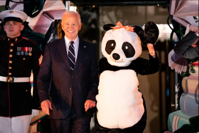 First Lady Jill Biden ise baştan aşağı panda kostümü giydi. Daha sonra kostümün kafa kısmını çıkararak kendini gösterdi. Bu kostüm seçimi, Washington’a yeni gelen pandaları kutlamak içindi.