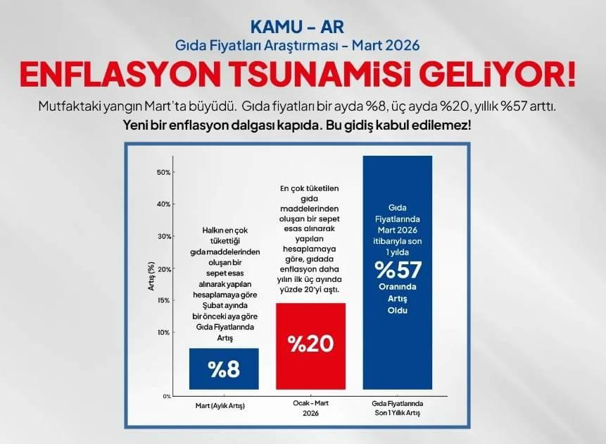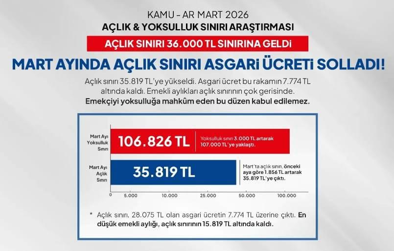 Birleşik Kamu-İş Konfederasyonu Ar-Ge birimi KAMU-AR’ın dört kişilik bir ailenin, dengeli ve sağlıklı beslenebilmesi için gereken gıda harcamasının yanı sıra diğer ihtiyaçlarını da yoksunluk hissi çekmeden karşılayabilmesi için yapması gereken aylık harcamayı dikkate alarak hesapladığı açlık-yoksulluk sınırı araştırmasının Mart 2026 sonuçları açıklandı. Açlık sınırının önceki aya göre 1.856 lira arttığı martta gıda dışındaki ihtiyaçlar için yapılması gereken harcama ise 1 bin 153 liralık yükselişle 71 bin 7 liraya çıktı. İkisinin toplamından oluşan yoksulluk sınırı ise önceki aya göre 3 bin 9 lira artarak 106 bin 826 lira oldu. Açlık sınırı son bir yıllık dönemde 10 bin 94 lira, gıda dışındaki ihtiyaçlar için yapılması gereken harcama 18 bin 502 lira ve yoksulluk sınırı 28 bin 596 lira arttı.