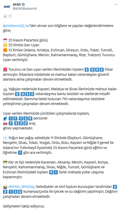 Kar ve tipi nedeniyle Karaman, Aksaray, Mersin, Kayseri, Konya, Nevşehir, Kahramanmaraş, Sivas, Niğde, Tunceli, Gümüşhane ve Erzincan illerimizdeki toplam 91 farklı noktada yollar ulaşıma kapanmıştır. AFAD, Kızılay, belediyeler ve sivil toplum kuruluşları tarafından 12 bin 130 kumanya/ çorba ile içecek ve su dağıtımı yapılmıştır. Dağıtım çalışmaları devam etmektedir.