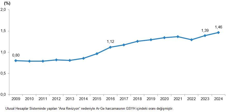Gayrisafi yurt içi Ar-Ge harcamasının GSYH içindeki oranı 2023 yılında %1,39 iken, 2024 yılında 44 trilyon 587 milyar 225 milyon TL’lik GSYH içindeki oranı %1,46 oldu.