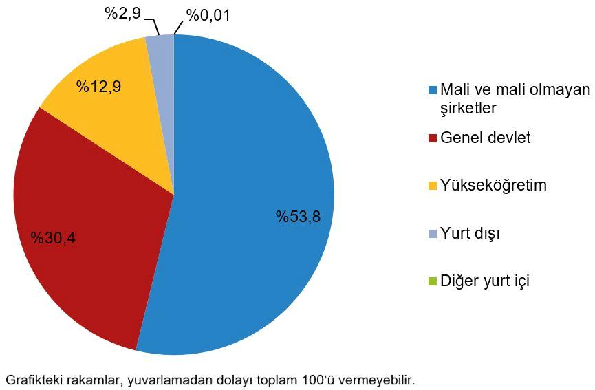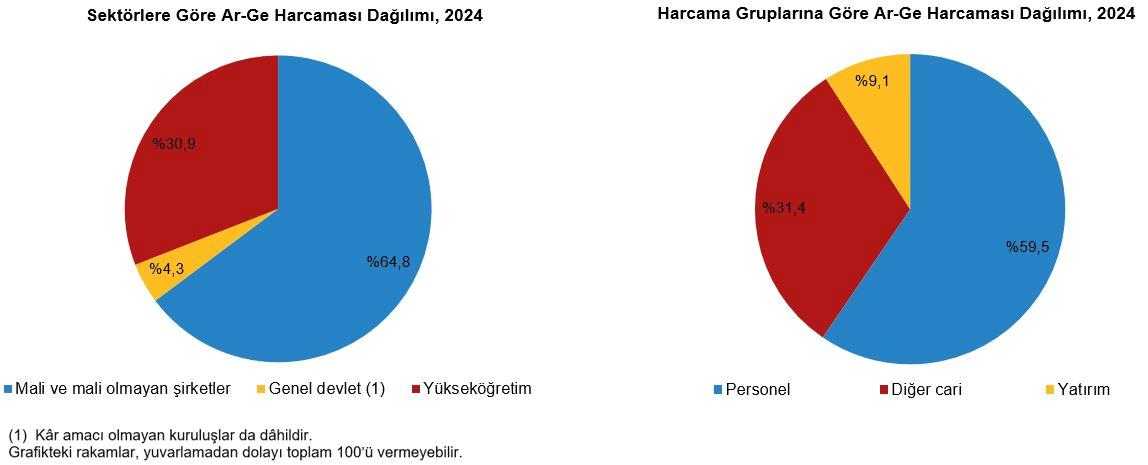Ar-Ge harcamalarında mali ve mali olmayan şirketler %64,8 ile en büyük hisseye sahip olurken, bunu %30,9 ile yükseköğretim takip etti. Kâr emeli olmayan kuruluşlar tarafından yapılan Ar-Ge harcamalarının da dâhil olduğu genel devlet Ar-Ge harcamalarının toplam Ar-Ge harcamaları içindeki hissesi ise %4,3 oldu. Ar-Ge harcamaları içerisinde işçi harcamaları %59,5 ile en büyük harcama kalemini oluşturdu.