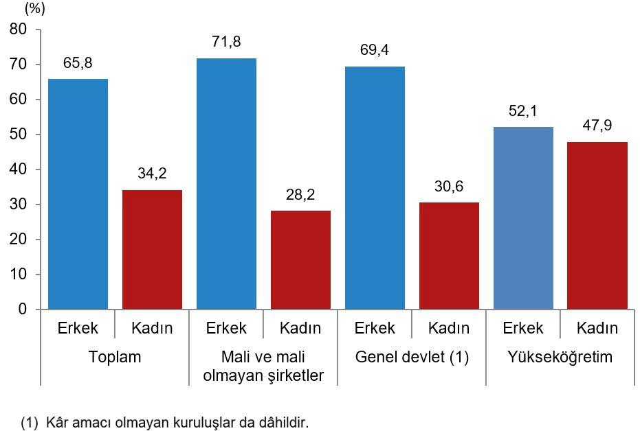 TZE cinsinden bayan Ar-Ge işçi sayısı, 2024 yılında 106 bin 74 kişi ile toplam Ar-Ge işçi sayısının %34,2’sini oluşturdu. Kesimler prestijiyle TZE cinsinden bayan Ar-Ge işçi oranı yükseköğretimde %47,9, kâr emeli olmayan kuruluşların da dâhil edildiği genel devlette %30,6, mali ve mali olmayan şirketlerde ise %28,2 oldu.
