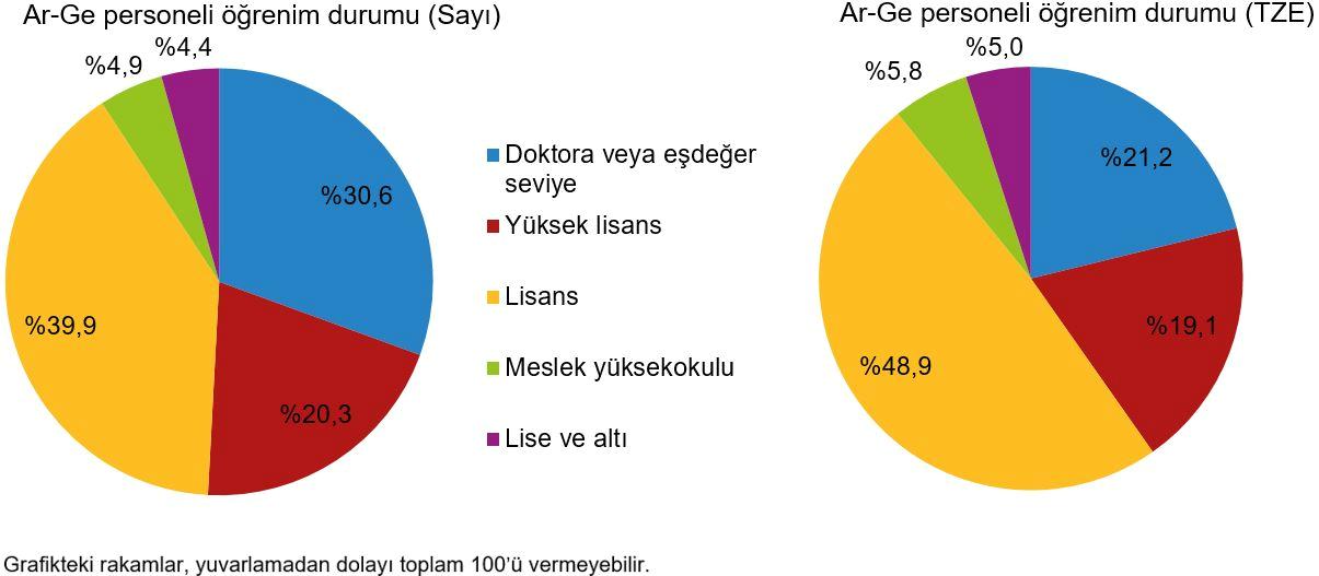 Ar-Ge işçisi tahsil durumuna nazaran incelendiğinde, Ar-Ge işçisinin %39,9’unun lisans eğitim seviyesine sahip olduğu görüldü. Bunu sırasıyla %30,6 ile doktora yahut muadili, %20,3 ile yüksek lisans, %4,9 ile meslek yüksekokulu ve %4,4 ile lise ve altı kategorileri takip etti. TZE cinsinden Ar-Ge çalışanının eğitim durumuna nazaran dağılımı ise sırasıyla; %48,9 ile lisans, %21,2 ile doktora yahut muadili, %19,1 ile yüksek lisans, %5,8 ile meslek yüksekokulu ve %5,0 ile lise ve altı eğitim seviyesi formunda oldu.