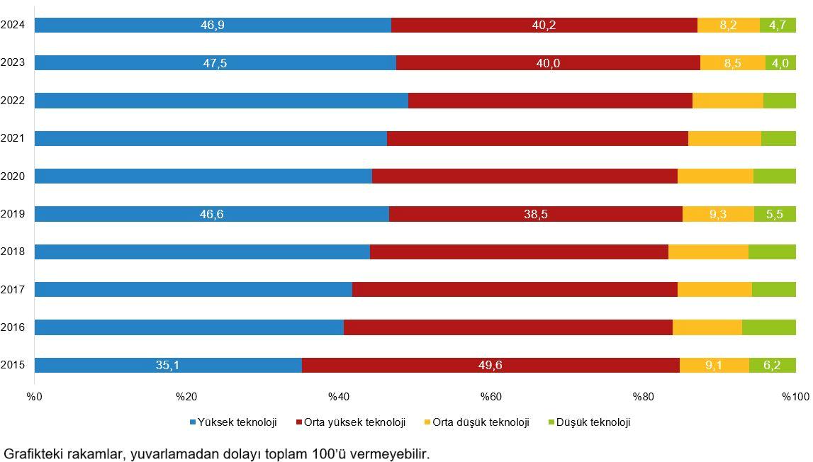 İmalat endüstrinde Ar-Ge faaliyeti yürüten teşebbüsler teknoloji seviyelerine nazaran sınıflandırıldığında, 2024 yılında imalat endüstrinde gerçekleştirilen 210 milyar 506 milyon TL Ar-Ge harcamasının %46,9’unun yüksek teknoloji faaliyetinde yer alan teşebbüsler tarafından gerçekleştirildiği görüldü. İmalat sanayindeki toplam Ar-Ge harcamasının %40,2’si orta yüksek teknoloji faaliyetindeki teşebbüsler, %8,2’si orta düşük teknoloji faaliyetindeki teşebbüsler ve %4,7’si düşük teknoloji faaliyetindeki teşebbüsler tarafından yapıldı.
