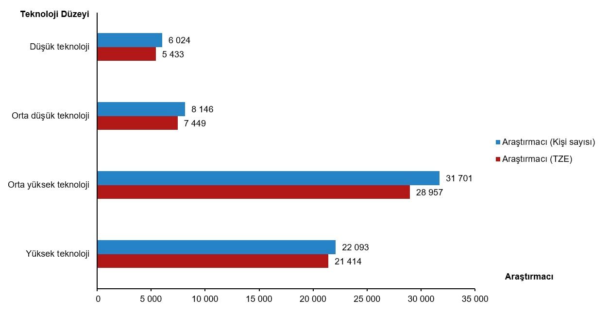 İmalat endüstrinde Ar-Ge faaliyeti yürüten girişimlerdeki araştırmacı sayıları incelendiğinde 2024 yılında en fazla araştırmacının 31 bin 701 kişi ile orta yüksek teknoloji faaliyeti yürüten teşebbüsler tarafından istihdam edildiği görüldü. Bunu 22 bin 93 araştırmacı istihdamı ile yüksek teknoloji faaliyeti yürüten teşebbüsler takip etti. TZE cinsinden araştırmacı sayıları dikkate alındığında da en fazla bedelin 28 bin 957 ile orta yüksek teknoloji faaliyeti yürüten teşebbüslerde olduğu saptandı.