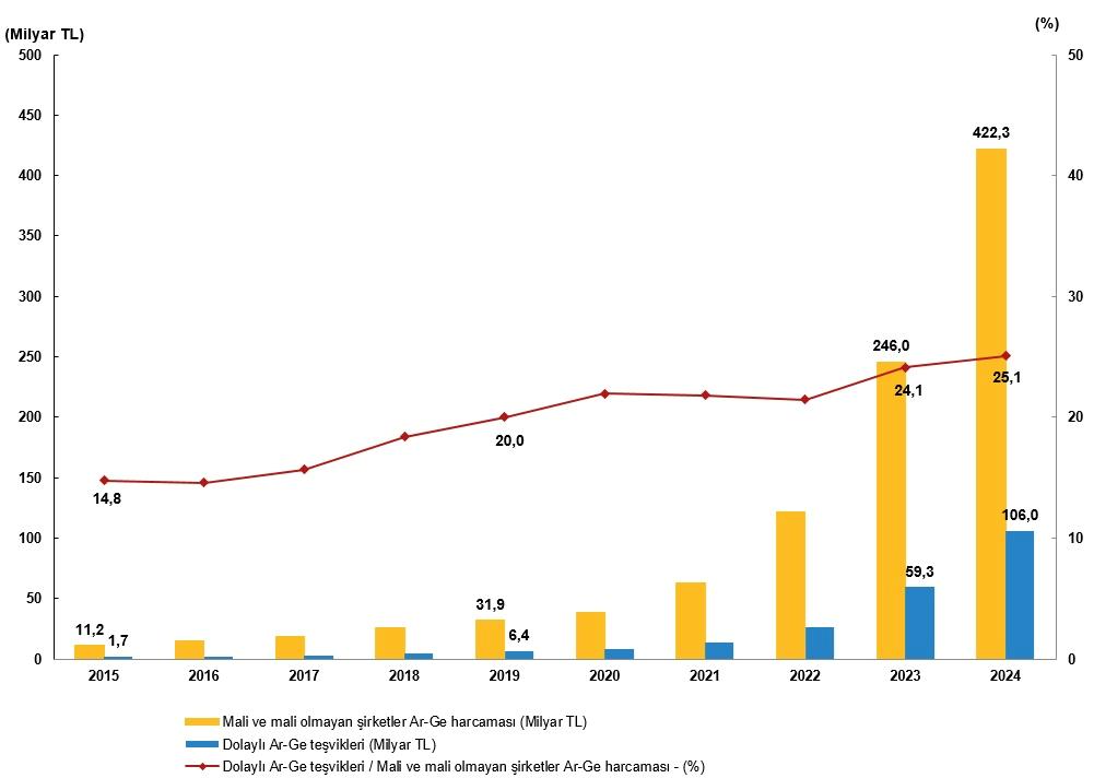 Dolaylı Ar-Ge teşviklerinin, mali ve mali olmayan şirketlerin Ar-Ge harcaması içerisindeki hissesi 2015 yılında %14,8 iken 2024 yılında %25,1’e yükseldi. Mali ve mali olmayan şirketlerin Ar-Ge harcaması 2015 yılında 11,2 milyar TL iken, bu harcamalar 2024 yılında 422 milyar TL’ye ulaştı.