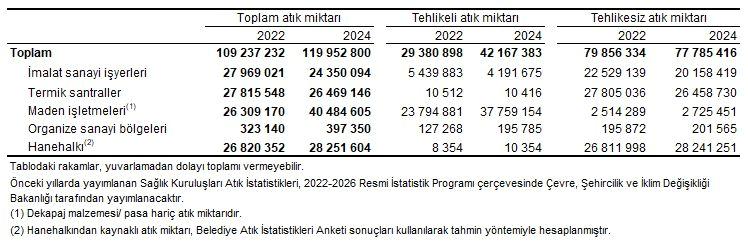 Araştırma kapsamındaki imalat sanayi işyerleri, maden işletmeleri, termik santraller, organize sanayi bölgeleri (OSB) ve hanehalklarında 2024 yılında 42,2 milyon tonu tehlikeli olmak üzere toplam 120 milyon ton atık oluştu.