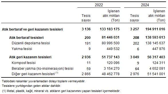 Atık bertaraf ve geri kazanım tesis göstergeleri, 2022, 2024