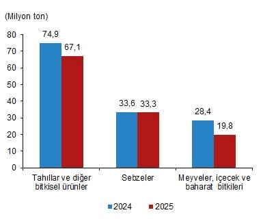 Üretim ölçülerinin, 2025 yılı ikinci iddiasında bir evvelki yıla nazaran tarla eserleri olan tahıllar ve başka bitkisel eserlerde (yem bitkileri hariç) %10,4, sebzelerde %0,8, meyveler, içecek ve baharat bitkilerinde %30,4 oranında azalacağı kestirim edildi. Buna nazaran, yaklaşık üretim ölçülerinin tahıllar ve başka bitkisel eserlerde 67,1 milyon ton, sebzelerde 33,3 milyon ton, meyveler, içecek ve baharat bitkilerinde ise 19,8 milyon ton olarak gerçekleşeceği öngörüldü.