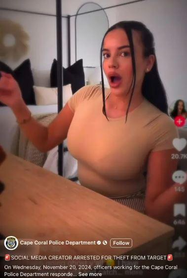 Florida‘da yaşayan ve 300 binden fazla takipçisi olan TikTok fenomeni, yerel bir mağazasından çaldığı ürünleri videoda gösterdikten sonra tutuklandı.