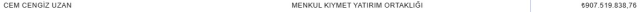 İstanbul Ataşehir Rıhtım vergi dairesine kayıtlı Cem Cengiz Uzan, en fazla vergi borcu olanlar listesinde 39. sırada yer aldı. Uzan’ın, Esas faaliyet konusu olarak menkul kıymet yatırım ortaklığı işinde olduğu ve bu işten dolayı 907 milyon 519 bin 838 lira 76 kuruş vergi borcu olduğu ortaya çıktı.