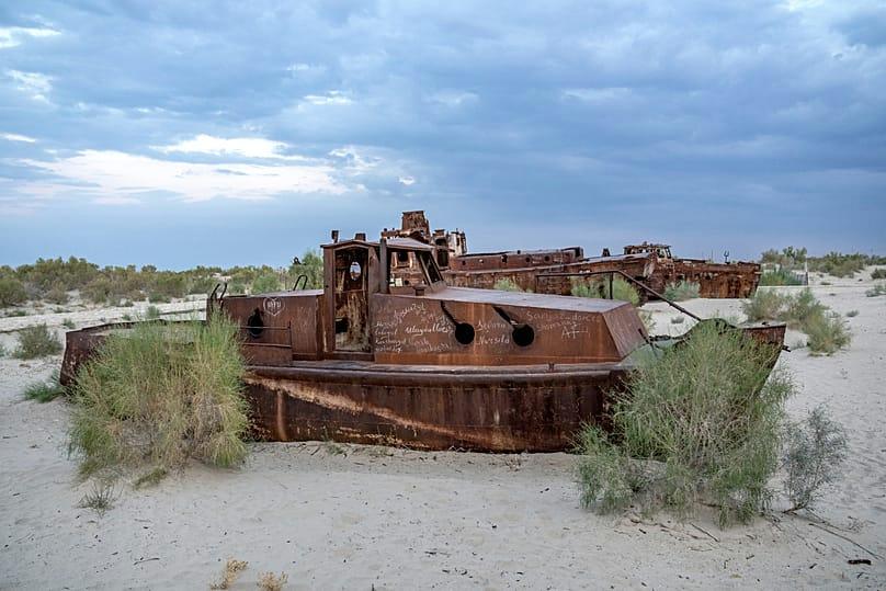 The dried out Aral Sea, located between Uzbekistan and Kazakhstan, has been called “the poster child for environmental catastrophe.”