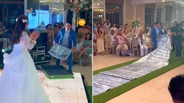 Filipinler‘de gerçekleşen bir düğünde, damadın geline taktığı ilginç para kolyesi sosyal medyada viral oldu. Görüntülerde, damadın bavuldan çıkardığı halı uzunluğundaki banknotları gelinin boynuna taktığı anlar yer alıyor.