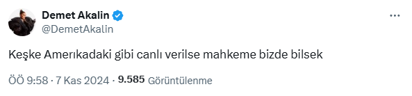 Duruşmaya ilişkin bir paylaşım yapan Akalın “Keşke Amerika’daki gibi canlı verilse mahkeme biz de bilsek” ifadelerini kullandı.