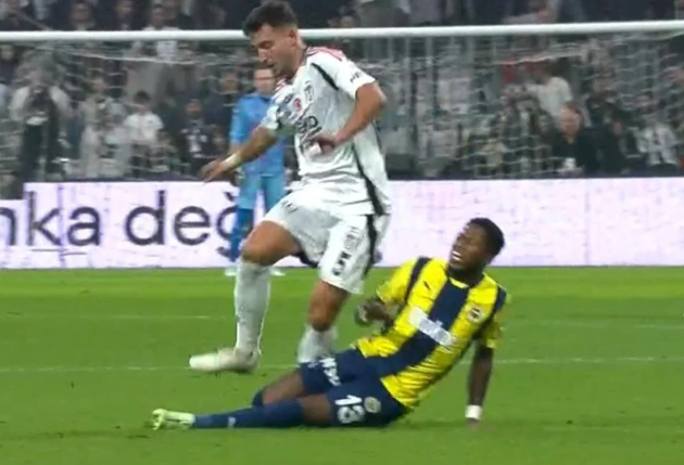 Deniz Çoban: Kontrolsüz hareketi anlatırken bunu örnek gösterirsiniz. Topla oynasa bile karşınızda rakip var, sıçramasa sonuçları daha ağrı olur. Ofsayt vardı, ihlal sayılmaz değil. Beşiktaşlı oyuncu kartı görecek, oyun yine endirekt serbest vuruş ve ofsaytla başlayacak. Tartışmasız sarı kart.
