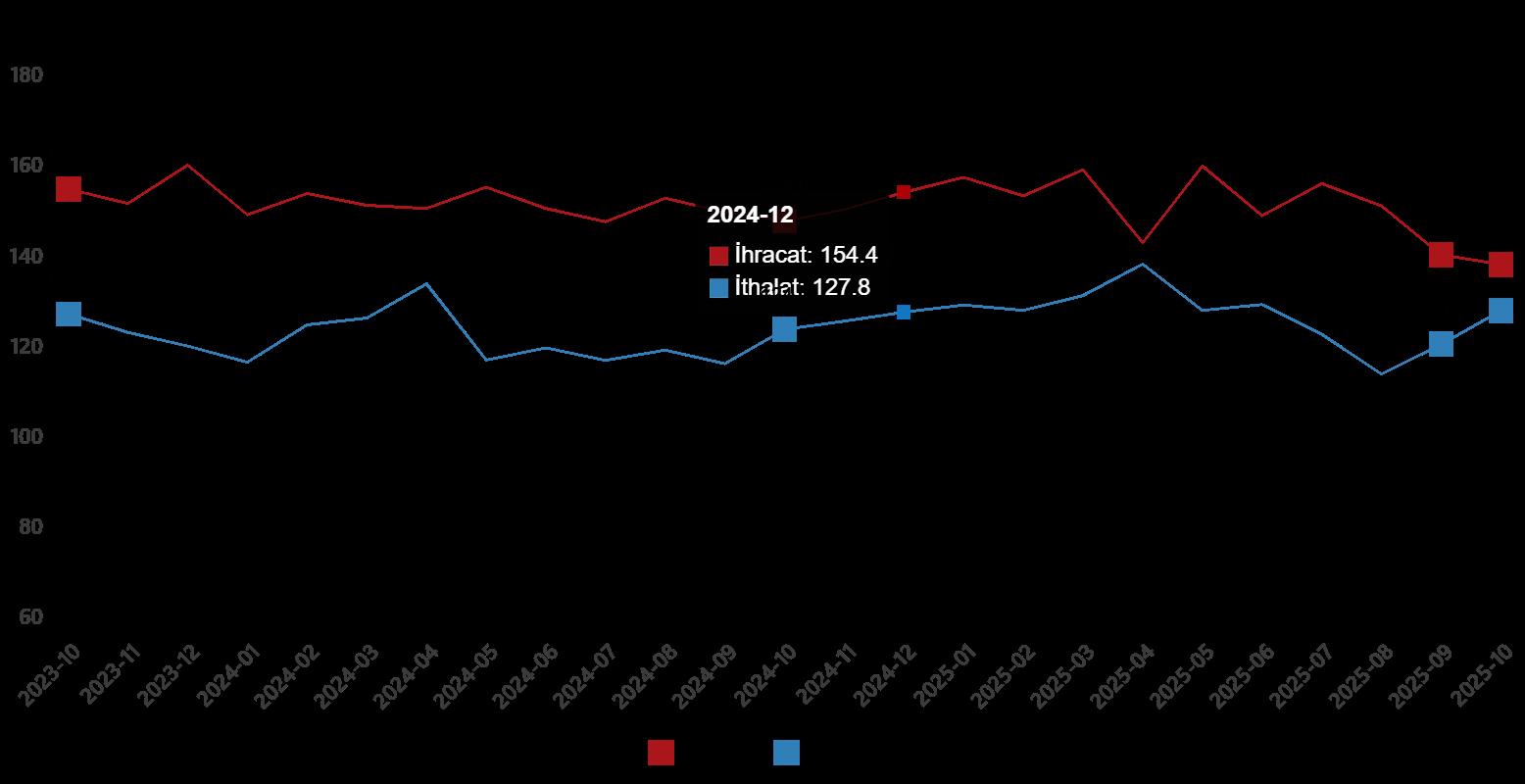 Mevsim ve takvim tesirlerinden arındırılmış seriye nazaran ihracat ölçü endeksi; 2025 Eylül ayında 140,5 iken 2025 Ekim ayında %1,5 oranında azalarak 138,4 oldu. Takvim tesirlerinden arındırılmış seriye nazaran ise ihracat ölçü endeksi; 2024 yılı Ekim ayında 153,9 iken 2025 yılı Ekim ayında %7,0 oranında azalarak 143,1 oldu.