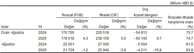 Ağustos ayında dış ticaret açığı %7,3 azalarak 5 milyar 450 milyon dolardan, 5 milyar 52 milyon dolara geriledi. İhracatın ithalatı karşılama oranı 2024 Ağustos ayında %78,4 iken, 2025 Ağustos ayında %79,5’e yükseldi.