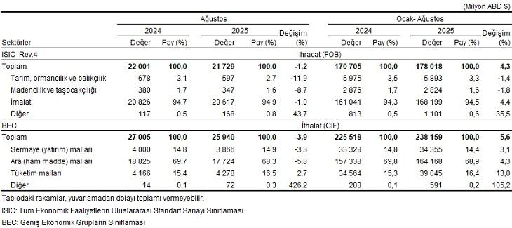 Türkiye İstatistik Kurumu ile Ticaret Bakanlığı iş birliğiyle genel ticaret sistemi kapsamında üretilen süreksiz dış ticaret bilgilerine nazaran; ihracat 2025 yılı Ağustos ayında, bir evvelki yılın tıpkı ayına nazaran %1,2 azalarak 21 milyar 729 milyon dolar, ithalat %3,9 azalarak 25 milyar 940 milyon dolar olarak gerçekleşti.