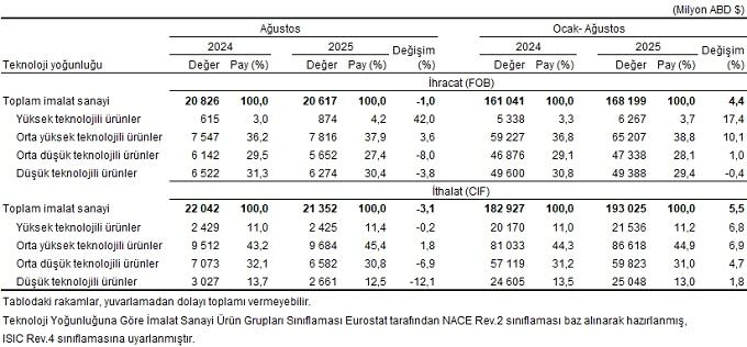 Teknoloji yoğunluğuna nazaran imalat sanayi eserleri dış ticareti, Ağustos 2025