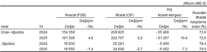 Ocak-Ağustos devrinde dış ticaret açığı %10,4 artarak 55 milyar 466 milyon dolardan, 61 milyar 257 milyon dolara yükseldi. İhracatın ithalatı karşılama oranı 2024 Ocak-Ağustos periyodunda %73,6 iken, 2025 yılının tıpkı devrinde %72,5’e geriledi.