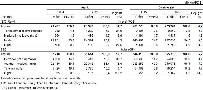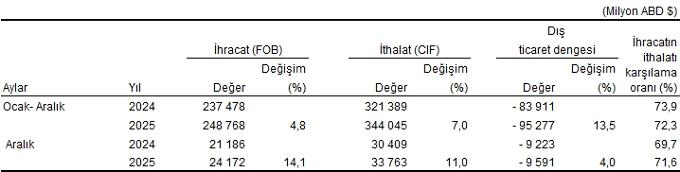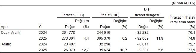 Türkiye İstatistik Kurumu ile Ticaret Bakanlığı iş birliğiyle genel ticaret sistemi kapsamında üretilen süreksiz dış ticaret datalarına nazaran; ihracat 2025 yılı Aralık ayında, bir evvelki yılın birebir ayına nazaran %12,7 artarak 26 milyar 373 milyon dolar, ithalat %10,7 artarak 35 milyar 674 milyon dolar olarak gerçekleşti.