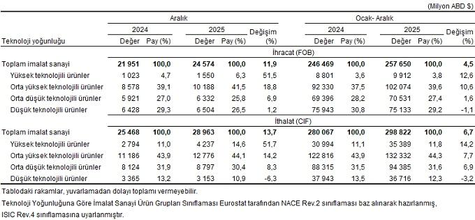 Teknoloji yoğunluğuna nazaran imalat sanayi eserleri dış ticareti, Aralık 2025