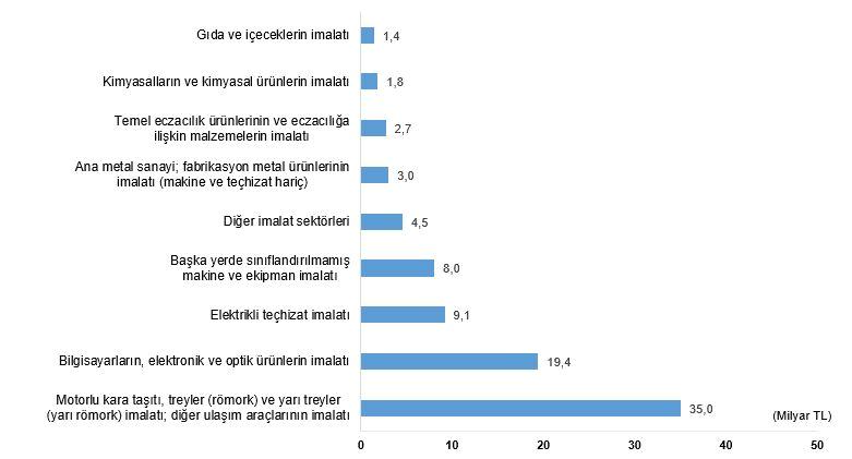 Ana faaliyeti imalat sanayi olan teşebbüslerde 85 milyar 56 milyon TL olan meblağın %41,1’inin motorlu kara taşıtı, treyler (römork) ve yarı treyler (yarı römork) imalatı; öteki ulaşım araçlarının imalatında, %22,8’inin bilgisayarların, elektronik ve optik eserlerin imalatında, %10,8’inin ise elektrikli teçhizat imalatında faaliyet gösteren teşebbüsler tarafından beyan edildiği görüldü.