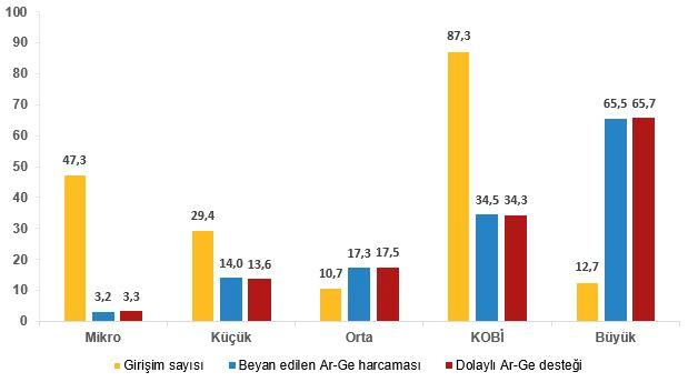 Dolaylı Ar-Ge teşviklerinden yararlanan teşebbüsler büyüklük kümelerine nazaran ele alındığında, 10 bin 569 teşebbüsün %87,3’ünün küçük ve orta büyüklükteki işletmeler (KOBİ) olduğu görüldü. Teşebbüs sayısı bakımından Ar-Ge teşviklerinden yararlanan büyük ölçekli teşebbüslerin hissesi %12,7 iken bu teşebbüsler dolaylı Ar-Ge teşviklerinin %65,7’sinden yararlandı.