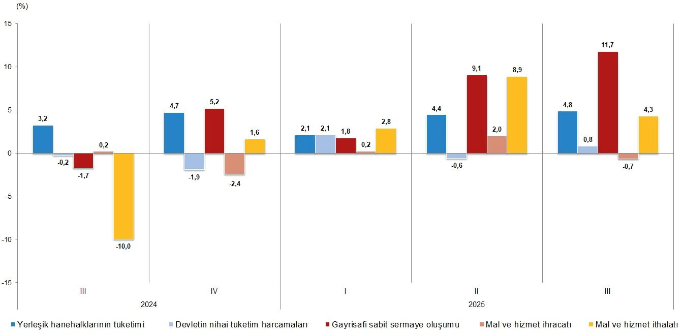 Yerleşik hanehalklarının kesin tüketim harcamaları 2025 yılının üçüncü çeyreğinde bir evvelki yılın tıpkı çeyreğine nazaran zincirlenmiş hacim endeksi olarak %4,8 arttı. Devletin en son tüketim harcamaları %0,8, gayrisafi sabit sermaye oluşumu ise %11,7 arttı.
