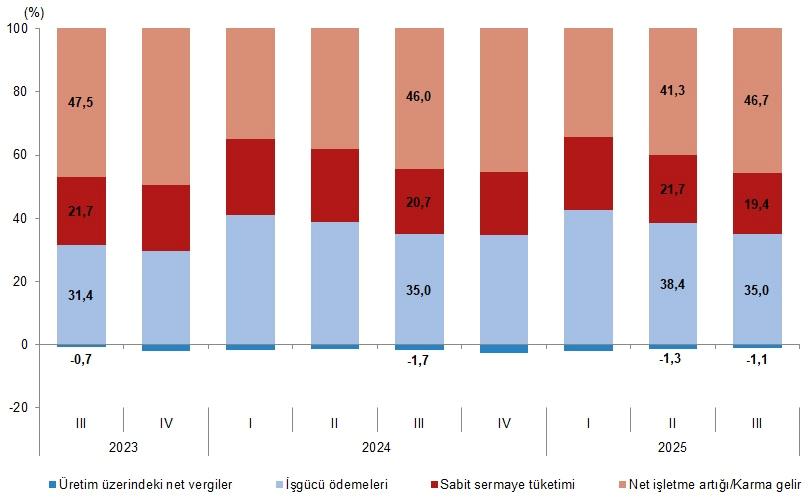 İşgücü ödemelerinin cari fiyatlarla Gayrisafi Katma Kıymet içerisindeki hissesi geçen yılın üçüncü çeyreğinde %35,0 iken, bu oran 2025 yılında da %35,0 oldu. Net işletme artığı/karma gelirin hissesi ise %46,0 iken %46,7 oldu.