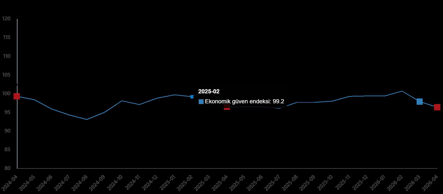 Ekonomik itimat endeksi Mart ayında 97,9 iken, Nisan ayında %1,5 oranında azalarak 96,4 pahasını aldı.