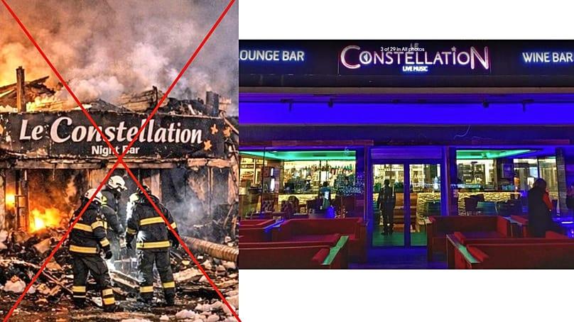 One image shared widely on X claims to show emergency workers operating outside a burned building with a “Le Constellation” sign.