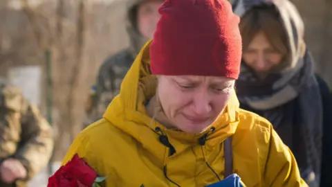 Back in Kyiv, Natalia clings to the arm of a friend, as grave diggers shovel fresh earth onto her husband’s coffin then slot a wooden cross into place on top.