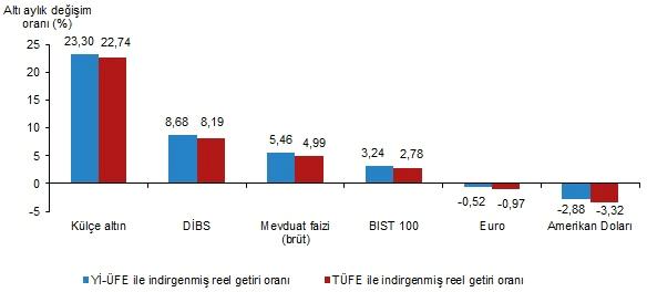 Yİ-ÜFE ile indirgendiğinde; yatırım araçlarından, Devlet İç Borçlanma Senetleri (DİBS) %1,89, BİST 100 endeksi %0,50 ve Amerikan Doları %0,26 oranlarında yatırımcısına gerçek getiri sağlarken; külçe altın %0,41 ve Euro %0,45 oranlarında yatırımcısına kaybettirdi. TÜFE ile indirgendiğinde ise DİBS %1,86, BİST 100 endeksi %0,47 ve Amerikan Doları %0,23 oranında yatırımcısına gerçek getiri sağlarken; külçe altın %0,44 ve Euro %0,48 oranlarında yatırımcısına kaybettirdi.