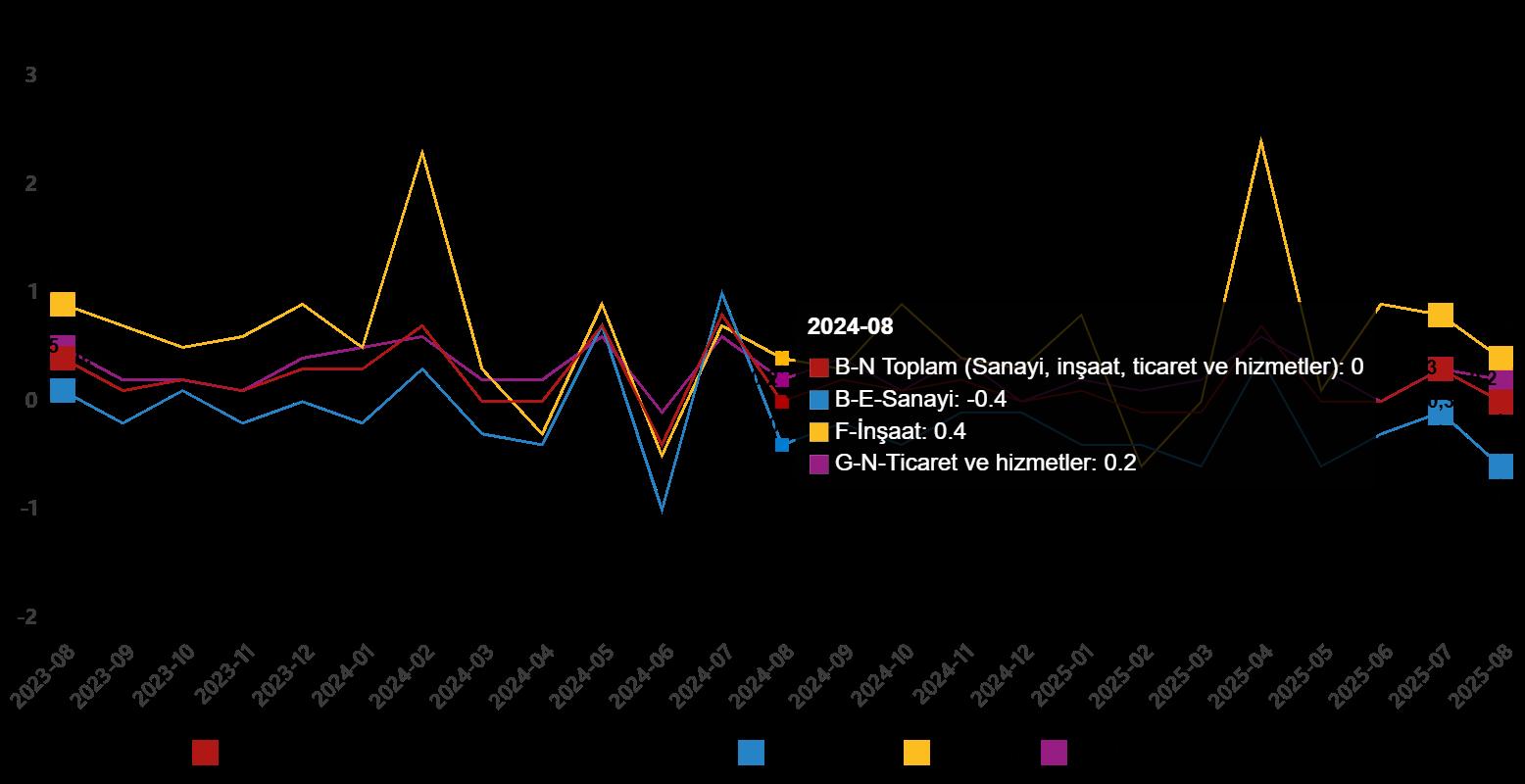 Ücretli çalışanların alt ayrıntılarına bakıldığında; 2025 Ağustos ayında fiyatlı çalışanlar aylık olarak sanayi dalında %0,6 azaldı, inşaat kesiminde %0,4 arttı ve ticaret-hizmet kesiminde %0,2 arttı.