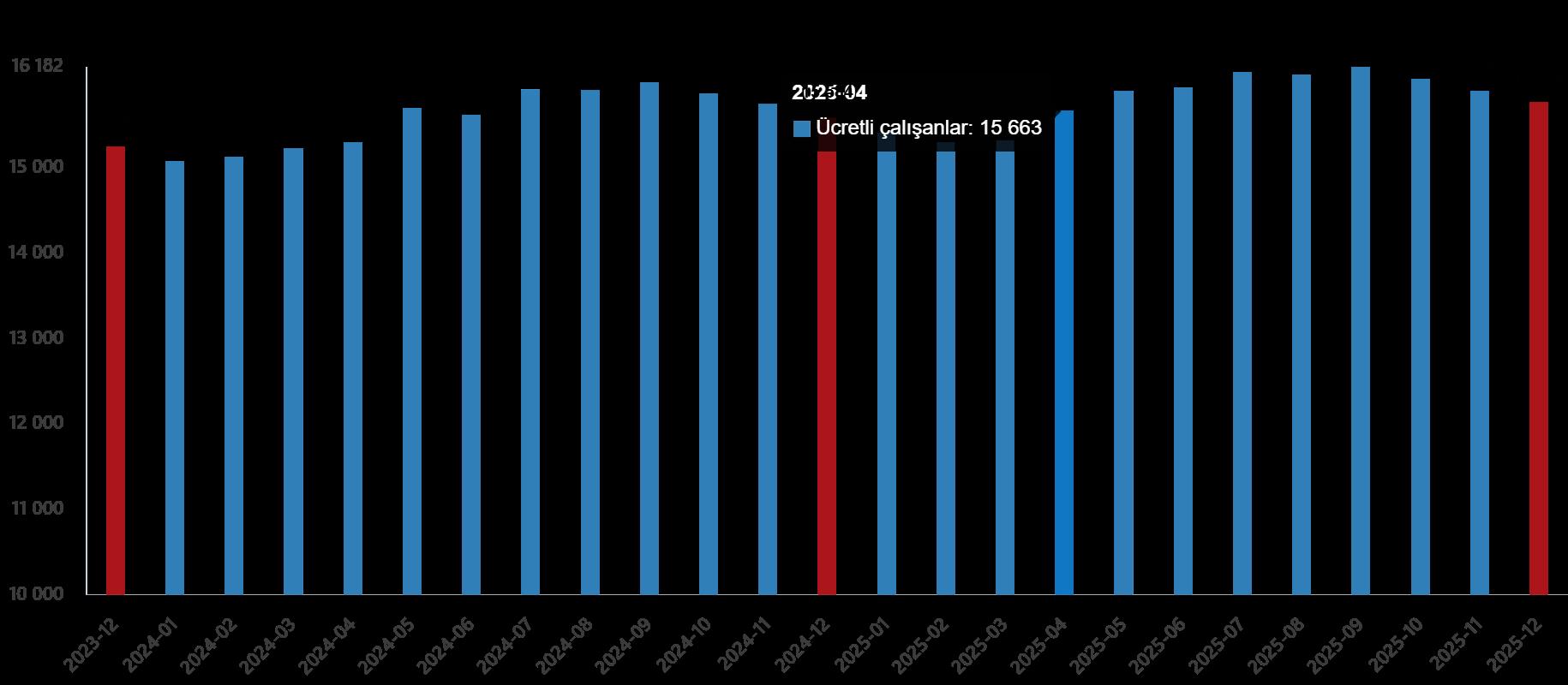 Ücretli çalışanların alt ayrıntılarına bakıldığında; 2025 Aralık ayında fiyatlı çalışan sayısı yıllık olarak sanayi dalında %3,6 azaldı, inşaat bölümünde %7,0 arttı ve ticaret-hizmet dalında %2,6 arttı.