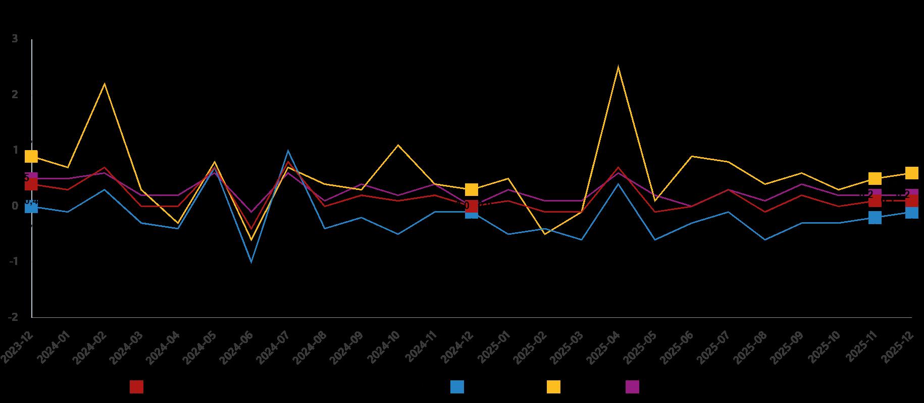 Ücretli çalışanların kesimlere nazaran aylık değişim oranları (%), Aralık 2025
