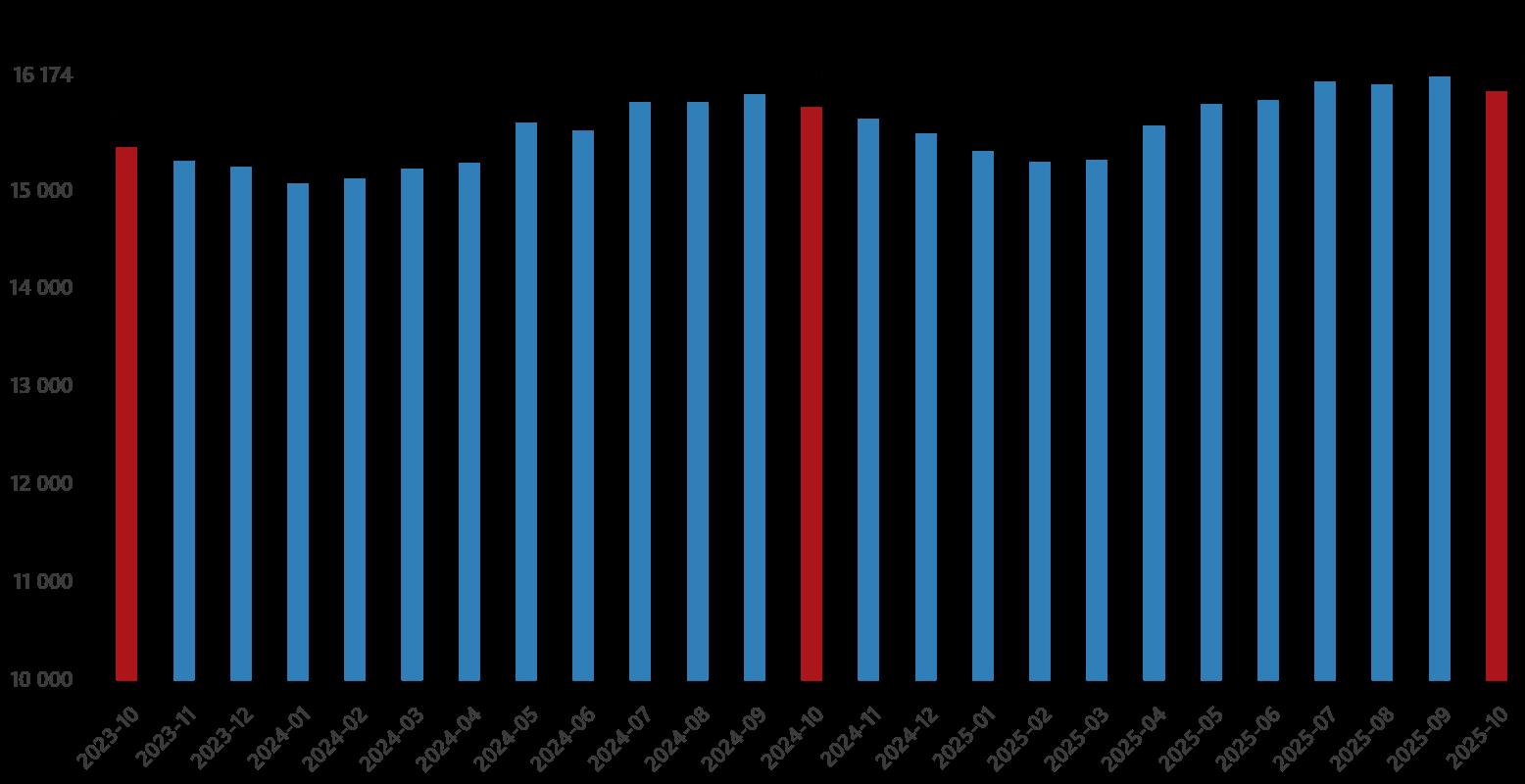 Sanayi, inşaat ve ticaret-hizmet bölümleri toplamında fiyatlı çalışan sayısı 2025 Ekim ayında bir evvelki yılın tıpkı ayına nazaran %1,0 arttı. Fiyatlı çalışan sayısı bir evvelki yılın tıpkı ayında 15 milyon 860 bin 31 kişi iken, 2025 yılı Ekim ayında 16 milyon 20 bin 394 kişi oldu.