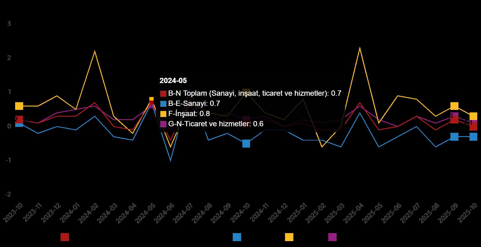 Ücretli çalışanların alt ayrıntılarına bakıldığında; 2025 Ekim ayında fiyatlı çalışan sayısı yıllık olarak sanayi bölümünde %3,5 azaldı, inşaat bölümünde %6,2 arttı ve ticaret-hizmet kesiminde %2,5 arttı.