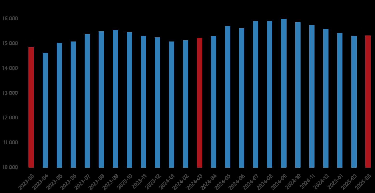 Sanayi, inşaat ve ticaret-hizmet kesimleri toplamında fiyatlı çalışan sayısı 2025 Mart ayında bir evvelki yılın birebir ayına nazaran %0,6 arttı. Fiyatlı çalışan sayısı bir evvelki yılın birebir ayında 15 milyon 224 bin 973 kişi iken, 2025 yılı Mart ayında 15 milyon 320 bin 987 kişi oldu.