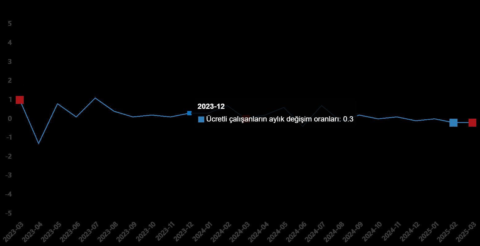Ücretli çalışanların alt ayrıntılarına bakıldığında; 2025 Mart ayında fiyatlı çalışanlar aylık olarak sanayi kesiminde %0,7 azaldı, inşaat kesiminde %0,7 azaldı ve ticaret-hizmet kesiminde %0,1 arttı.