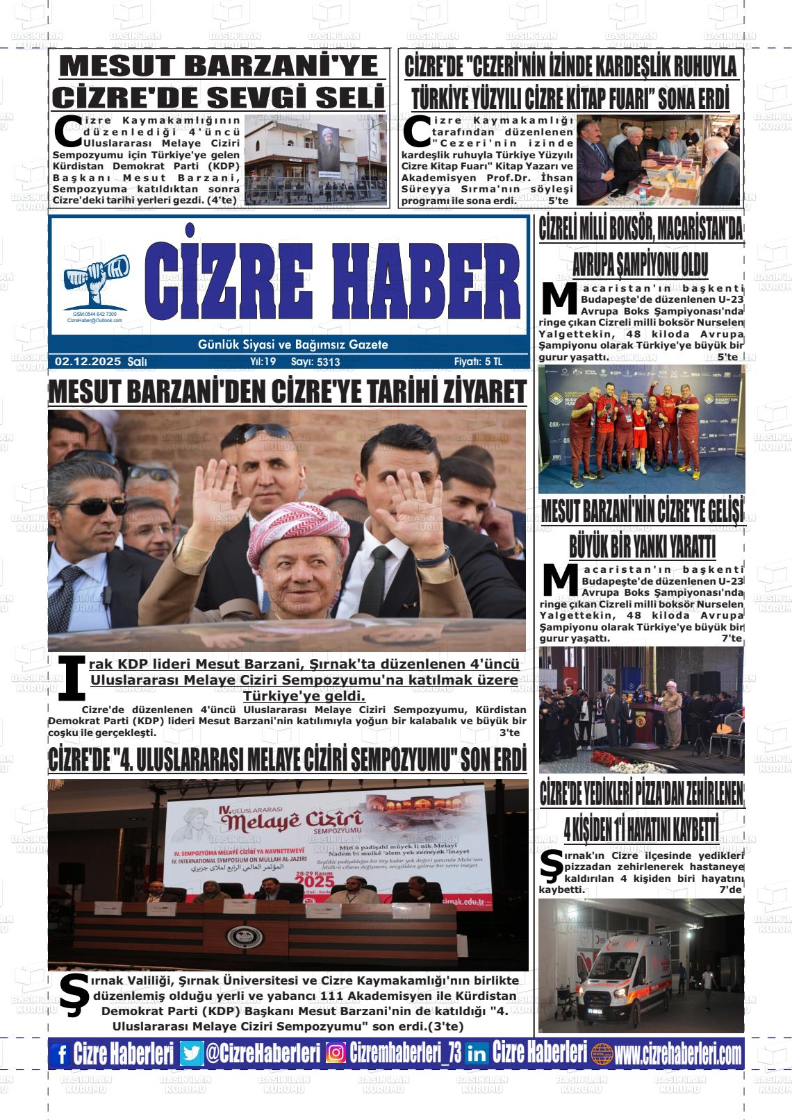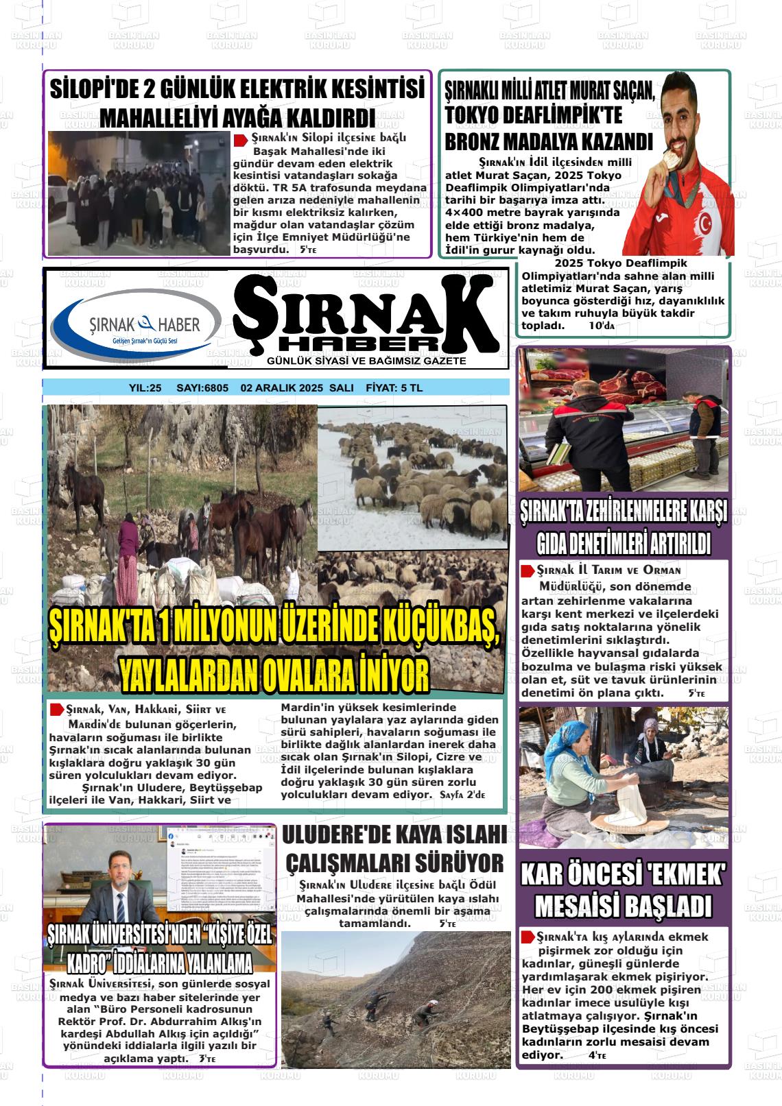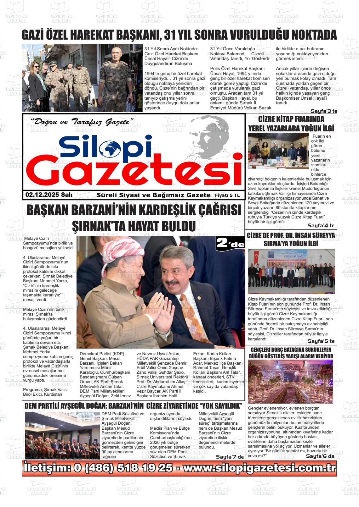 Şırnak Yerel Gazeteleri 02 Aralık 2025, Salı Günü Manşeti