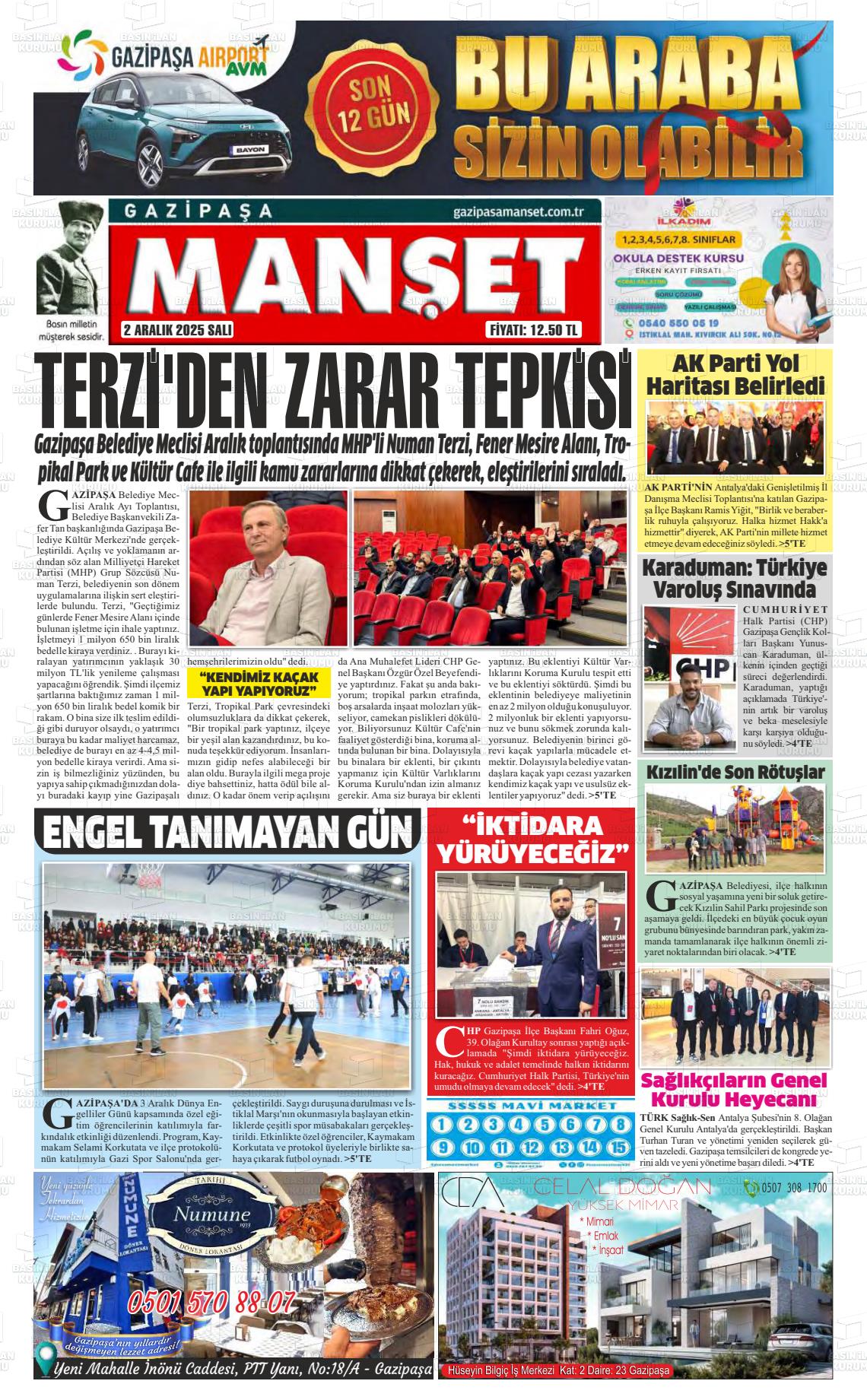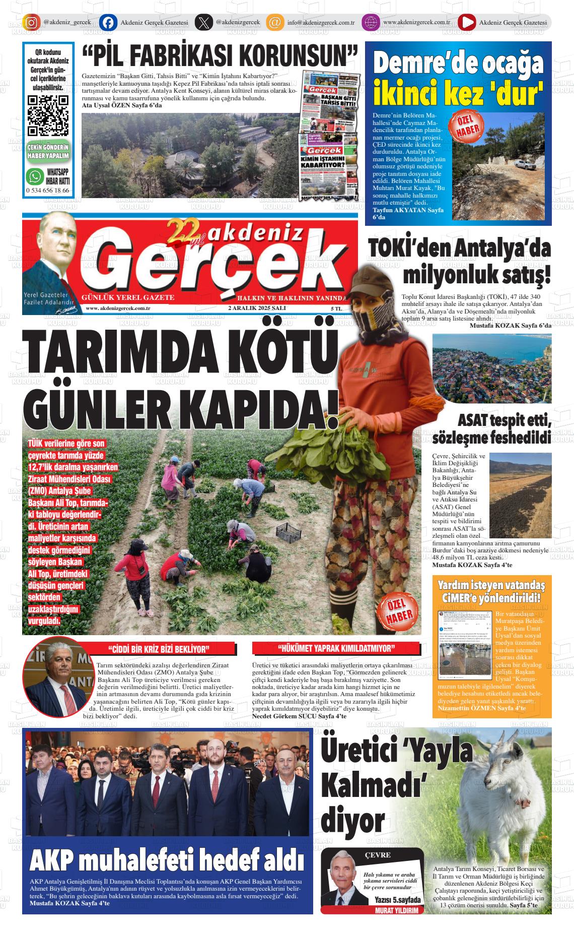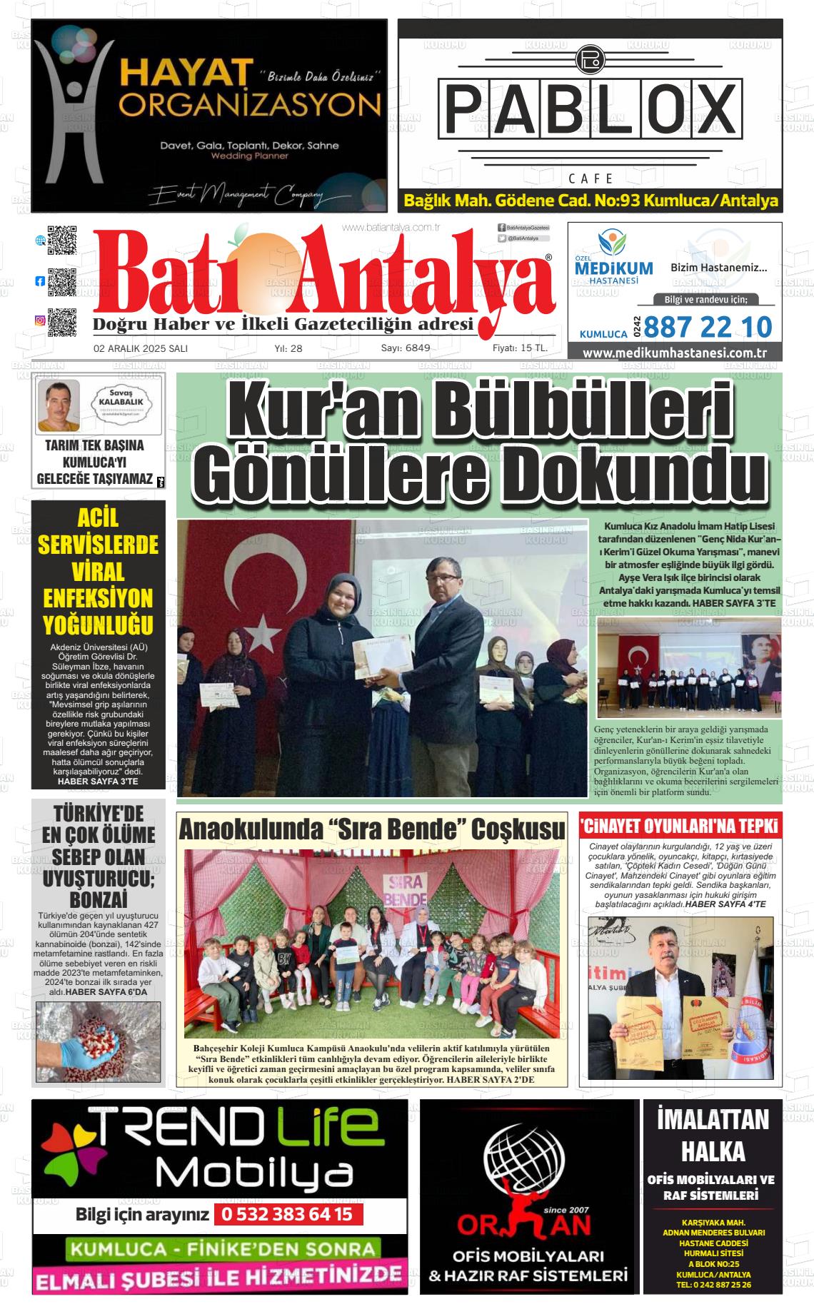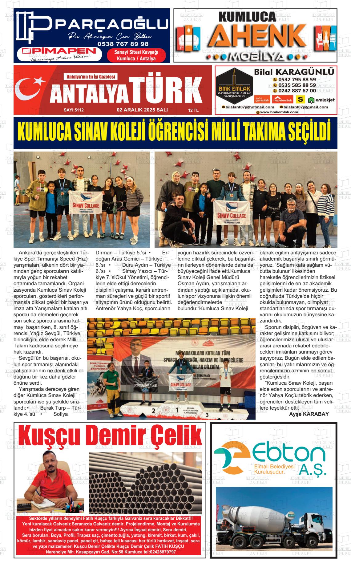 Antalya Yerel Gazeteleri 02 Aralık 2025, Salı Günü Manşeti