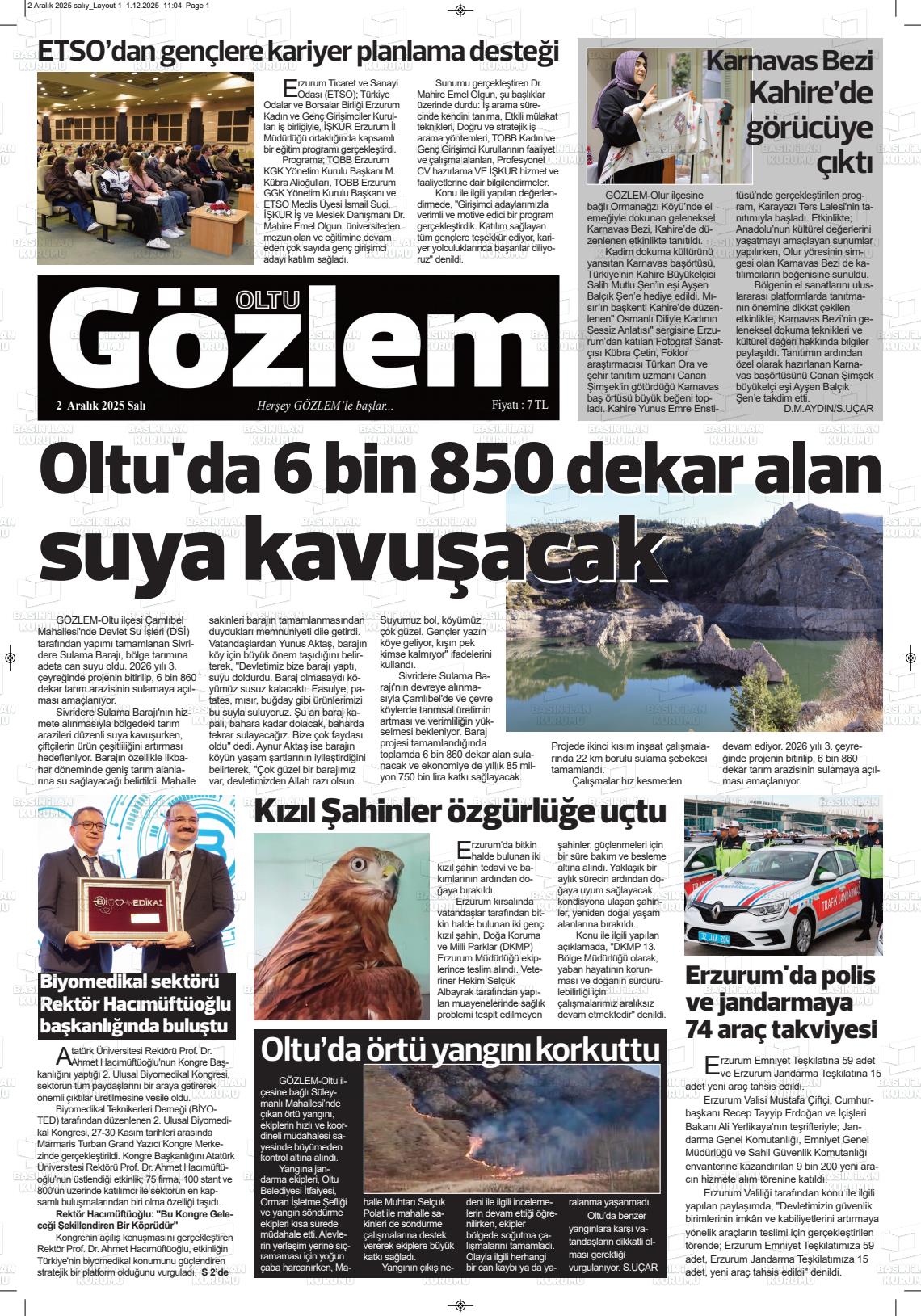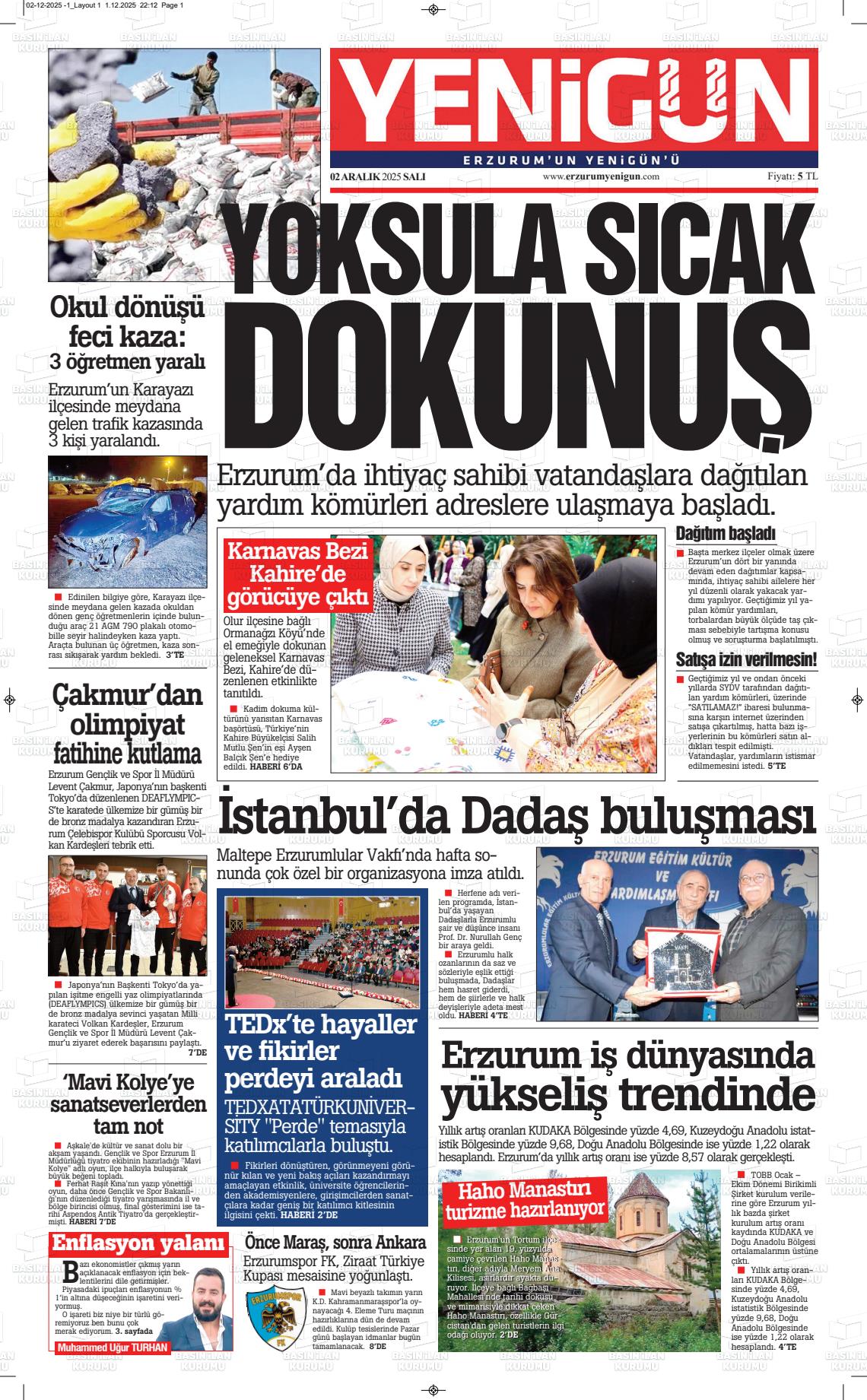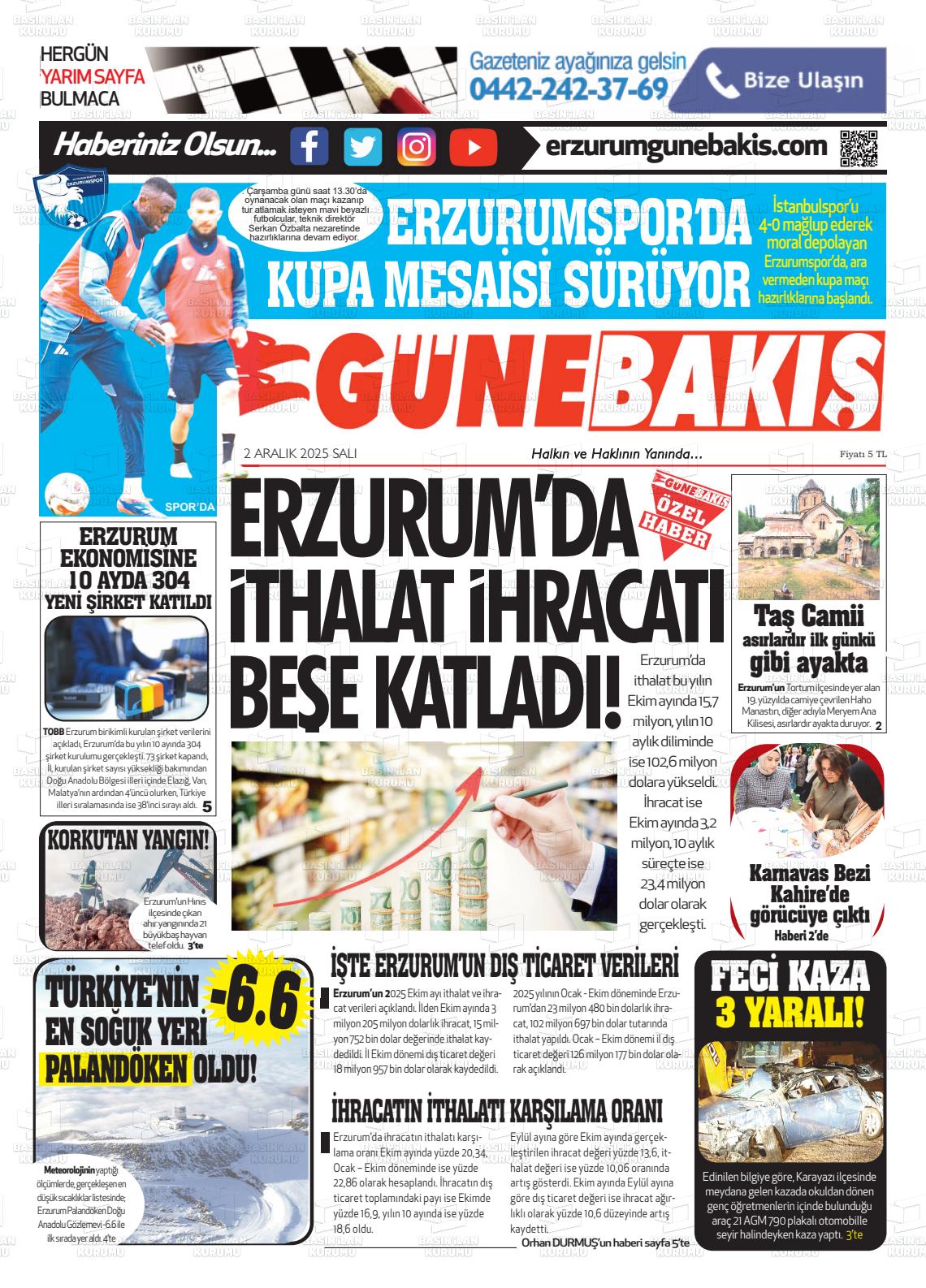 Erzurum Yerel Gazeteleri 02 Aralık 2025, Salı Günü Manşeti