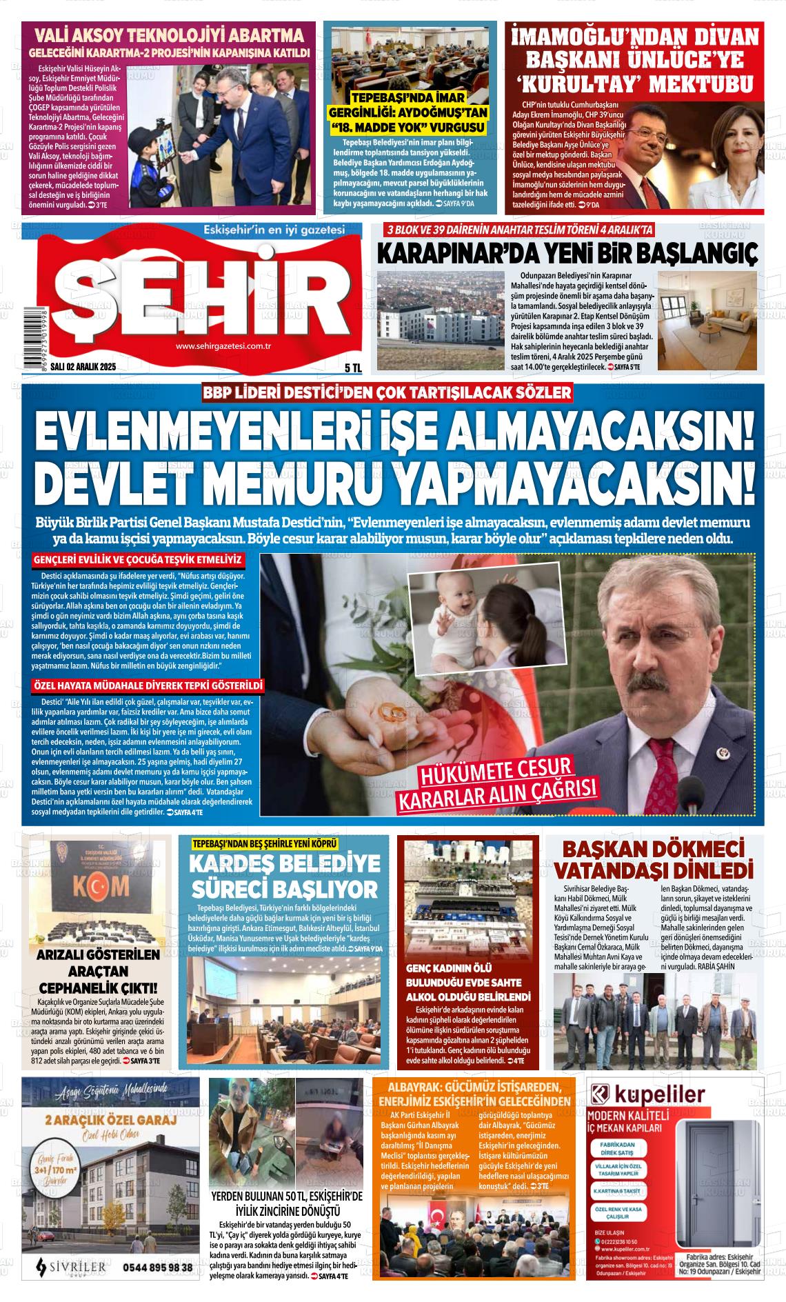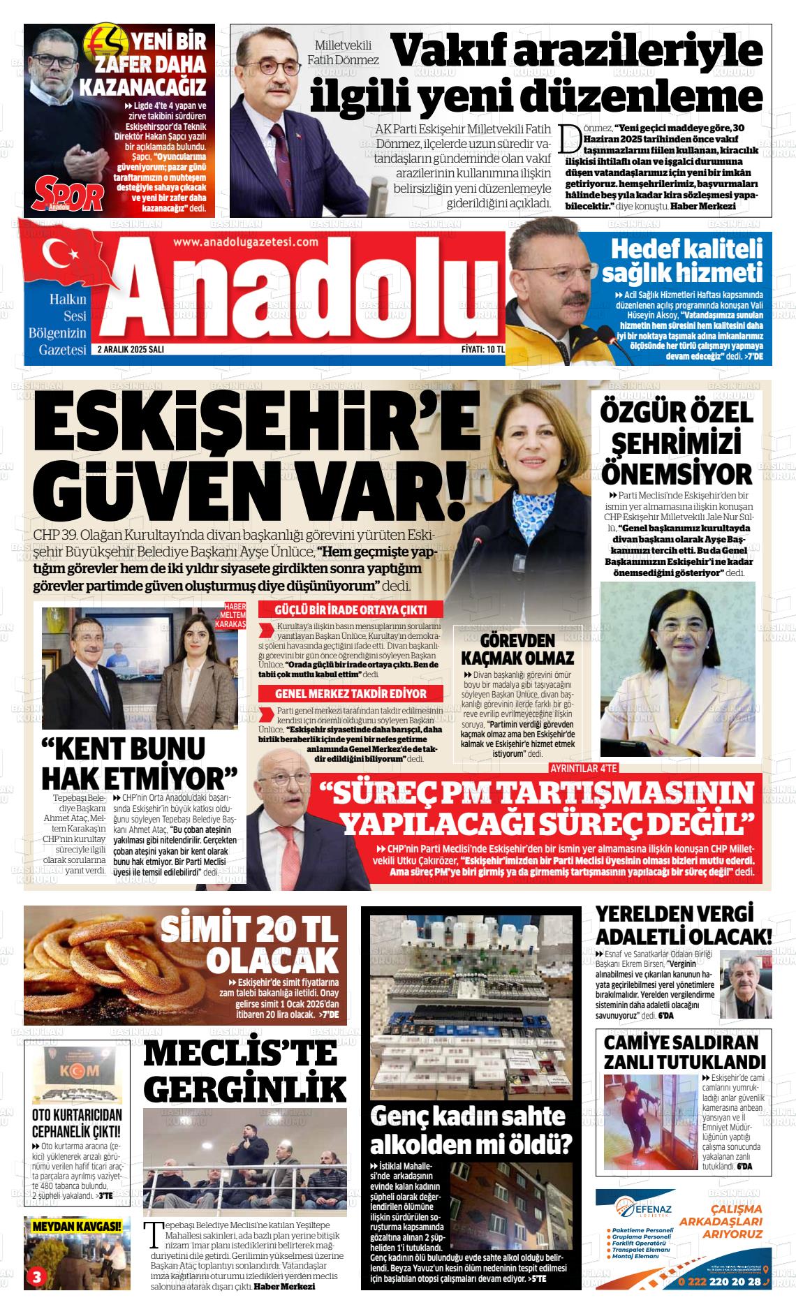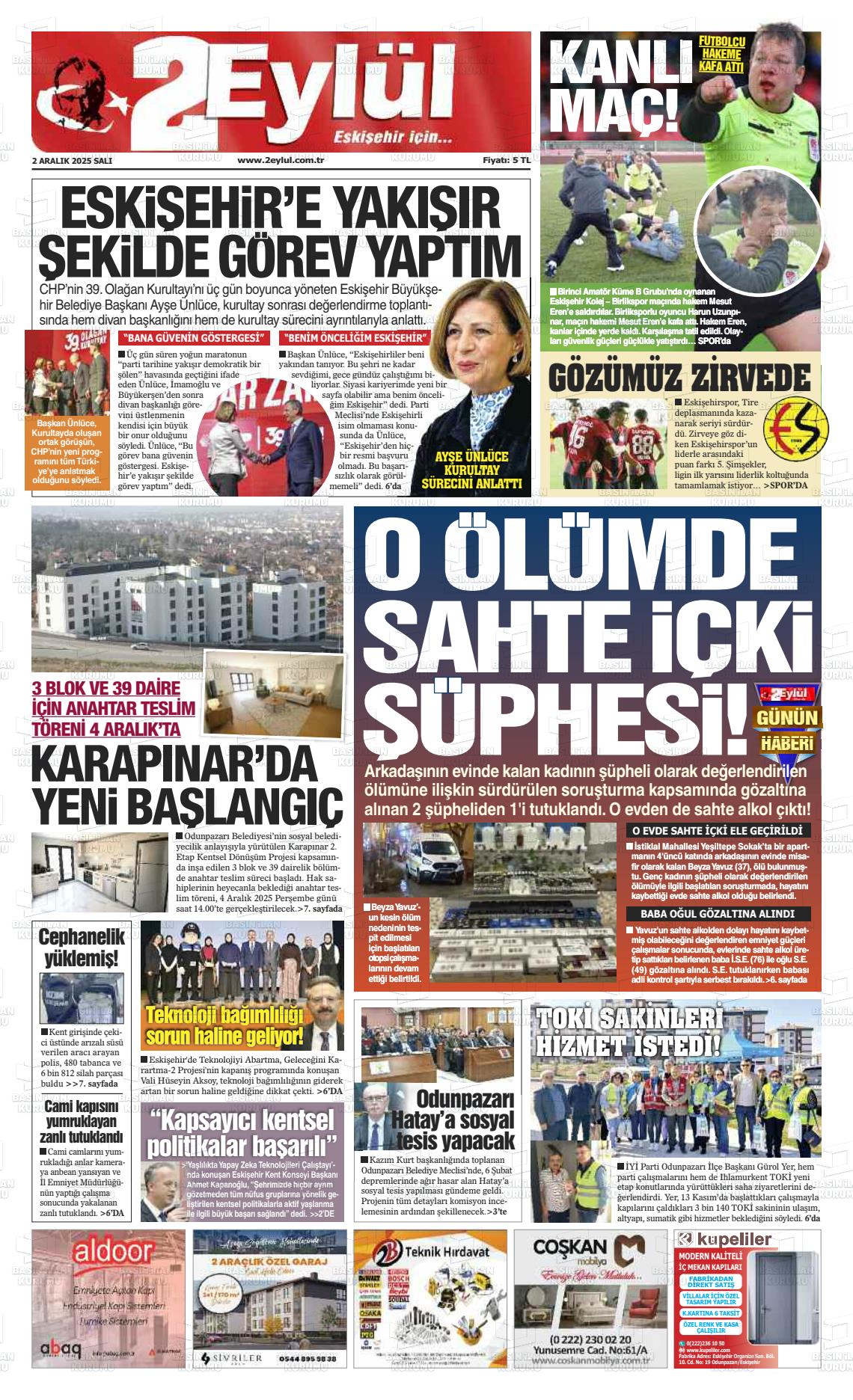 Eskİşehİr Yerel Gazeteleri 02 Aralık 2025, Salı Günü Manşeti