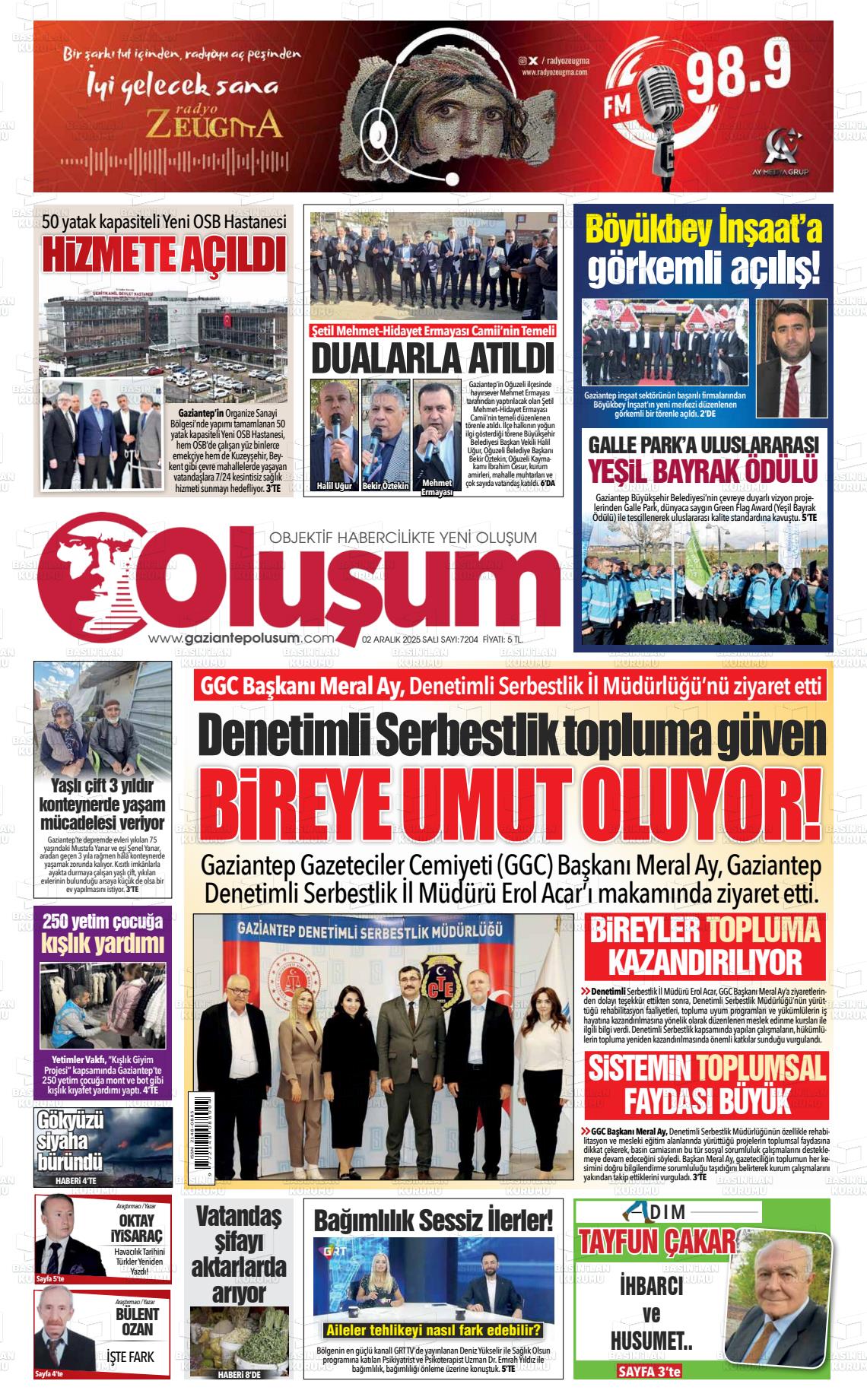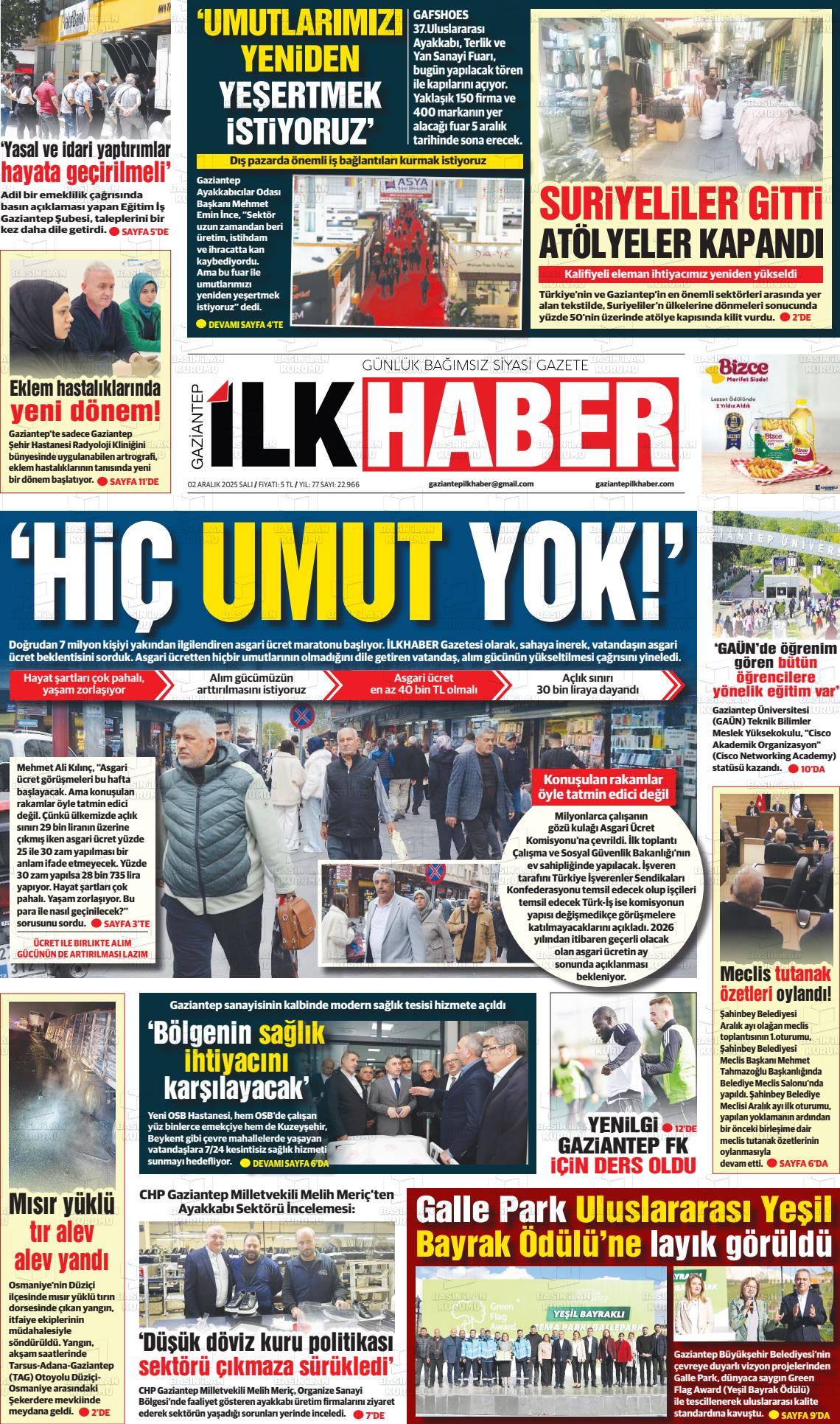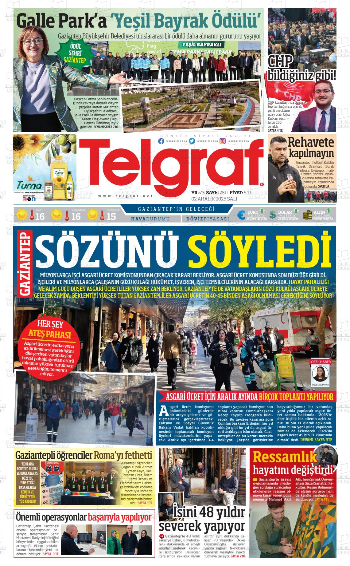 Gazİantep Yerel Gazeteleri 02 Aralık 2025, Salı Günü Manşeti