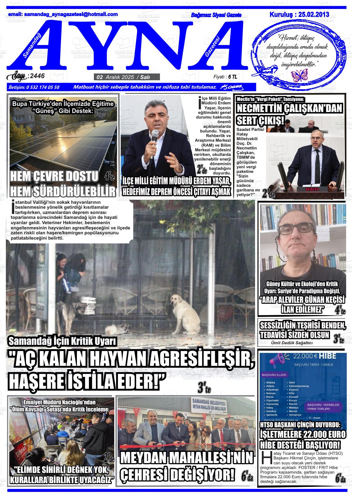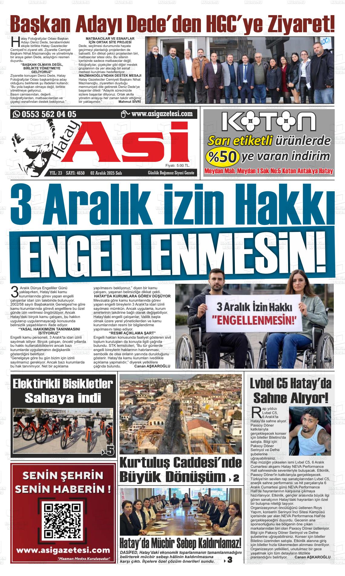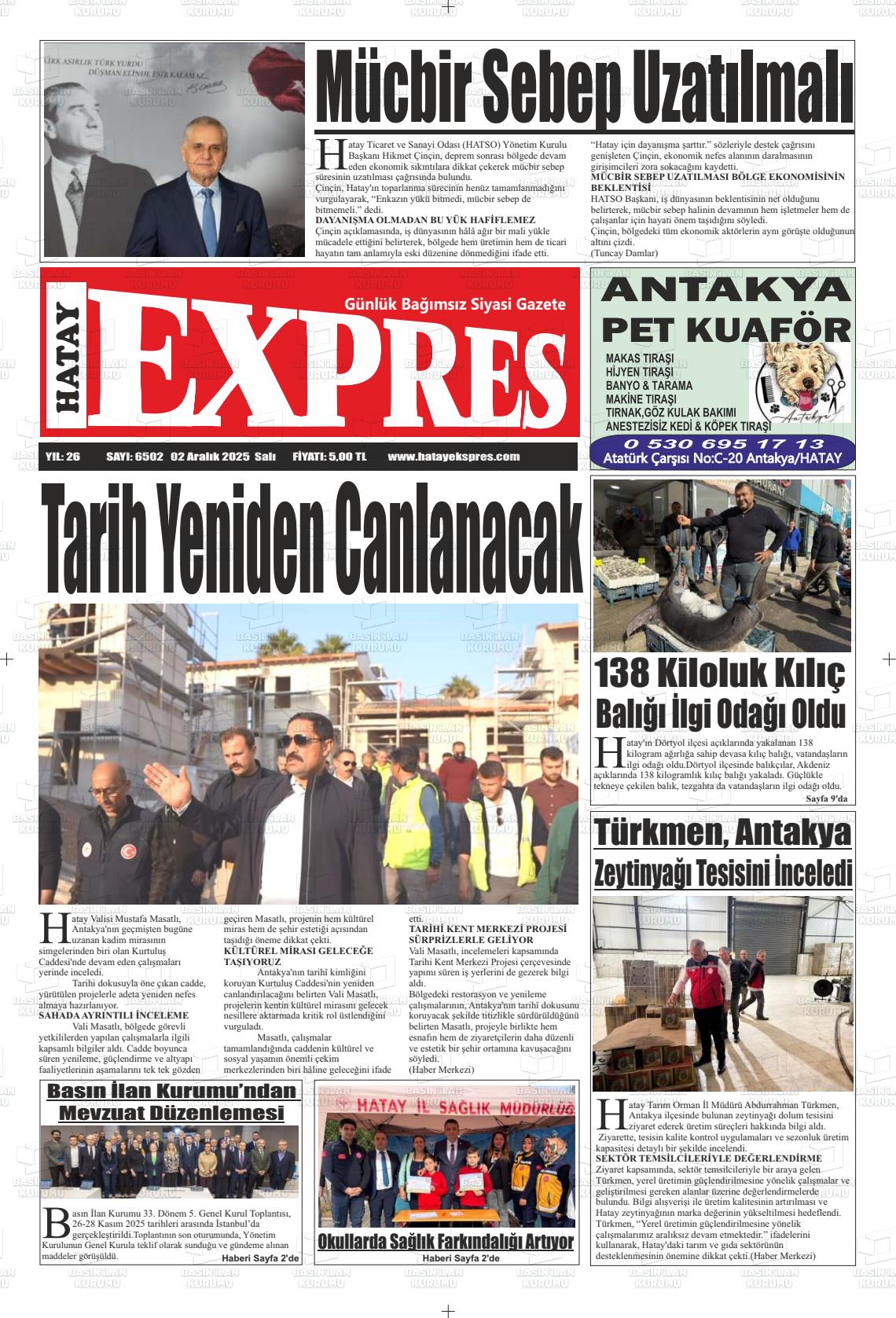 Hatay Yerel Gazeteleri 02 Aralık 2025, Salı Günü Manşeti