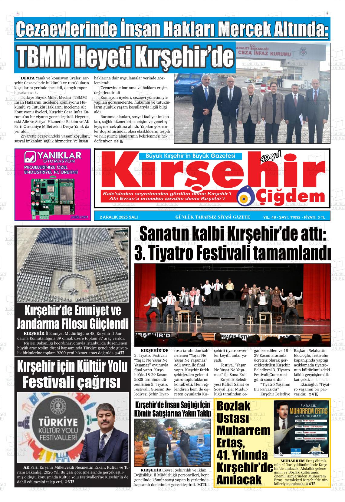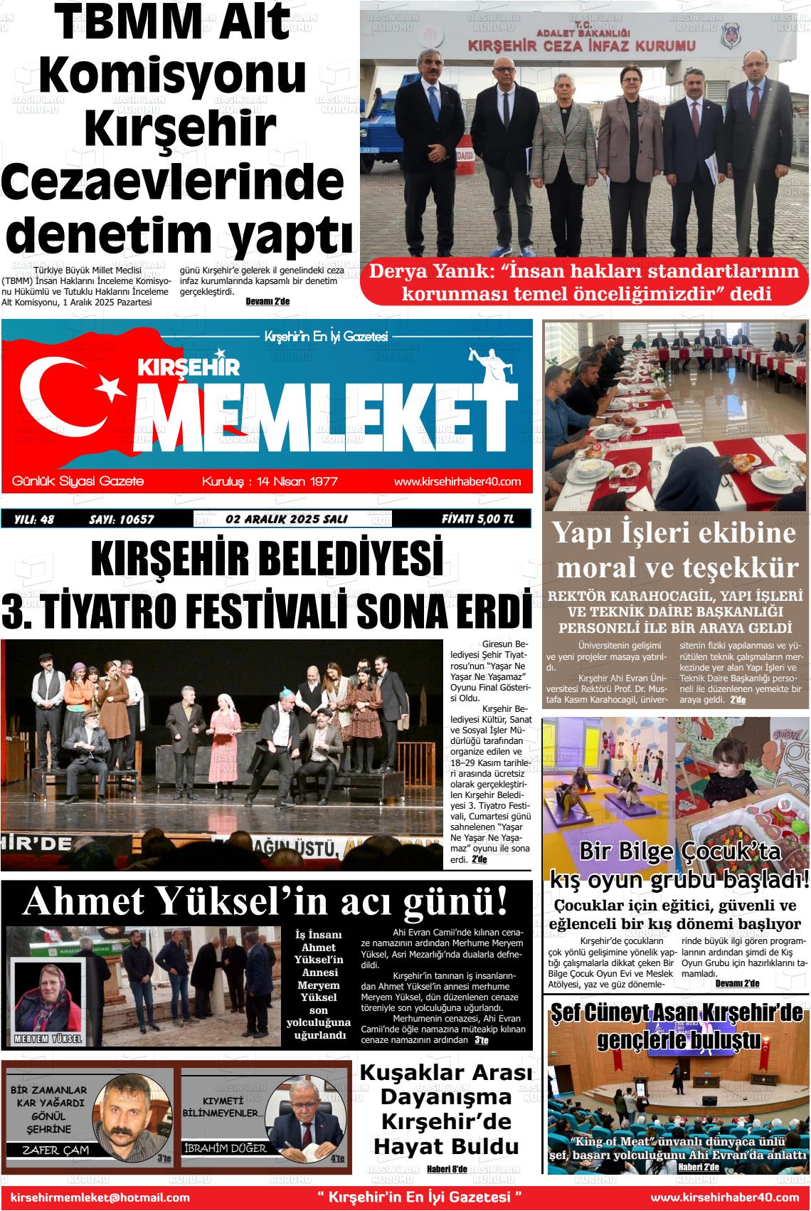 Kırşehİr Yerel Gazeteleri 02 Aralık 2025, Salı Günü Manşeti