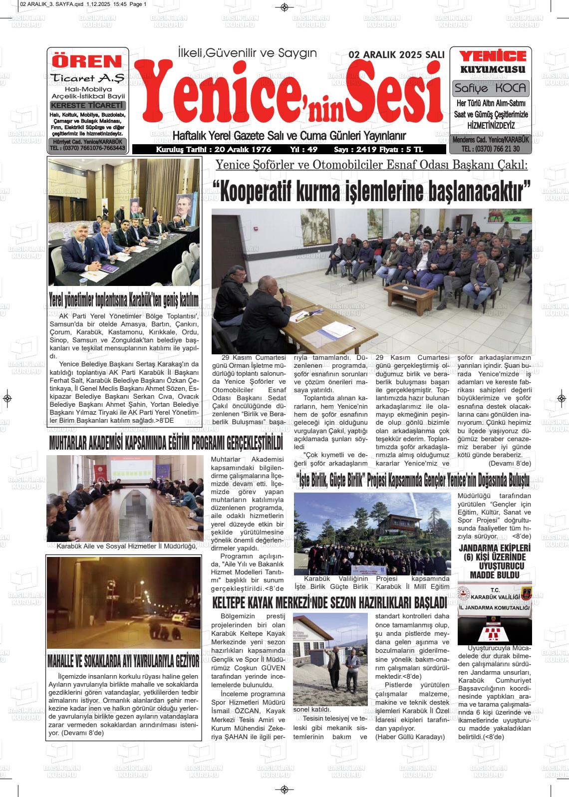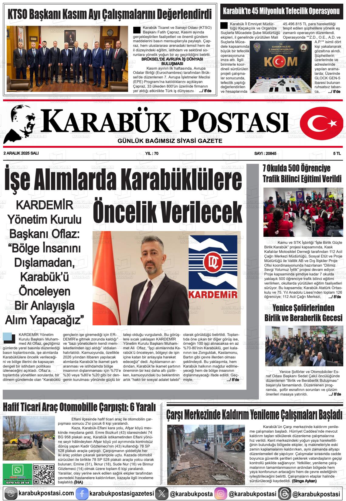 Karabük Yerel Gazeteleri 02 Aralık 2025, Salı Günü Manşeti